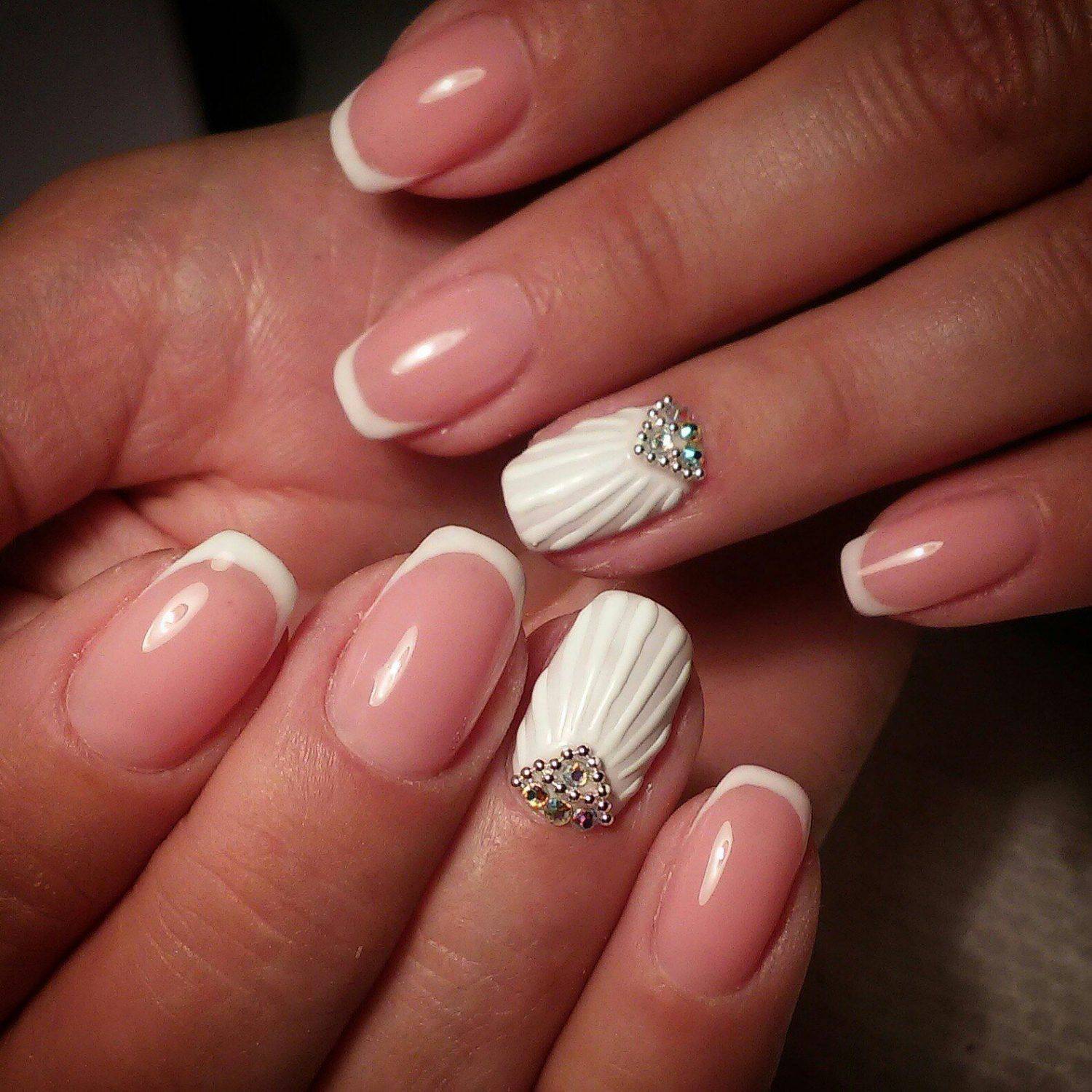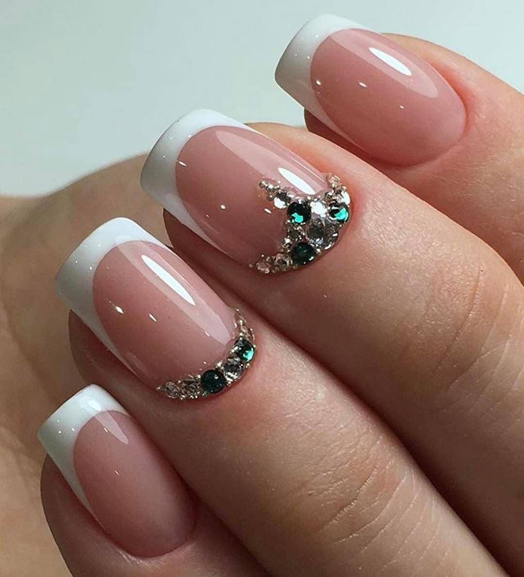 Классическое оформление французской техники предполагает обязательное использование в дизайне белого лака, при помощи которого кончик ногтевой пластины выделяется тонкой линией. Поэтому вариация с дуэтным сочетанием улыбки и прозрачного основания может уверенно занимать почётное место в списке белого нейл-дизайна. Такой маникюр смотрится нежно, изысканно и утончённо, а декор блестящими камушками или жемчугом делает его более интересным и выразительным. Способов расположения фрагментов декора при этом довольно много. Среди наиболее распространённых предложений и стильных новинок можно выделить расположение мелких блестящих частиц по границе белоснежного и прозрачного покрытия в виде тонкой линии и оригинальные вариации дизайна с шармами – композициями из страз на акцентном ноготке. Очень интересно смотрятся ноготки с узором из бусин или бульонок в прикорневой зоне и дублирование декором лунулы. Стразы могут быть цветными или прозрачными, в этом случае всё зависит от настроения и предпочтений барышни.