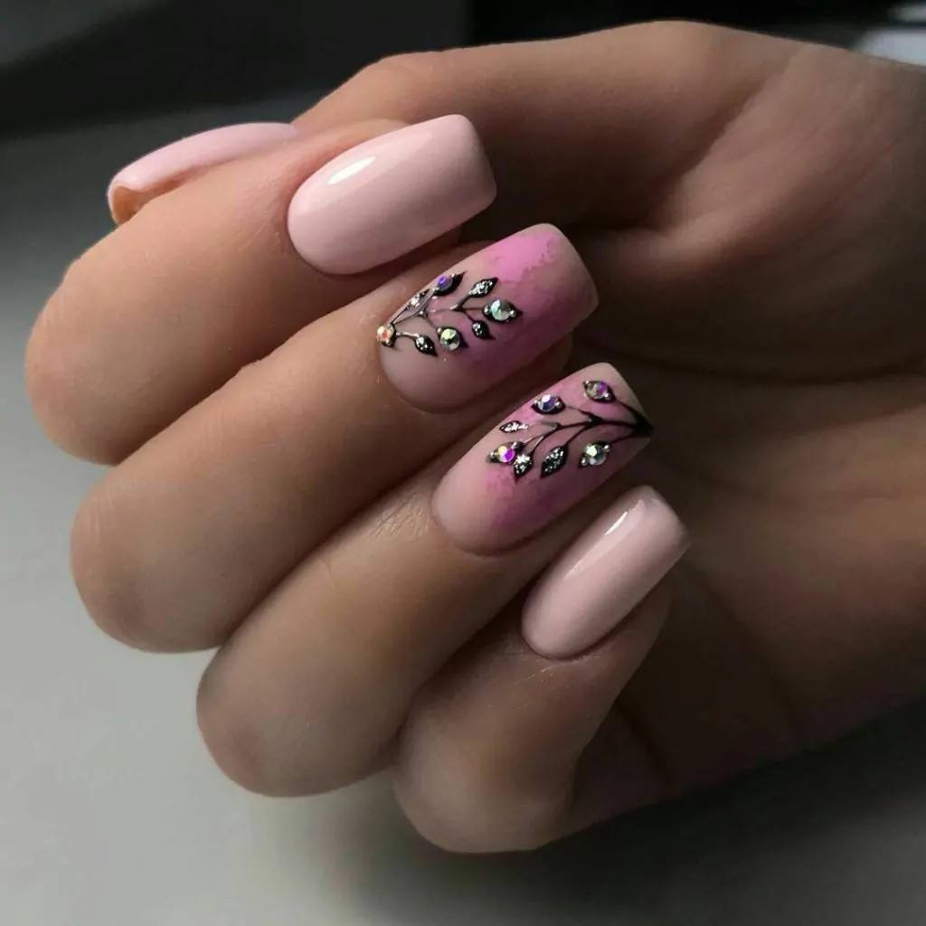 Маникюр с рисунком и стразами на квадратные ногти 2020