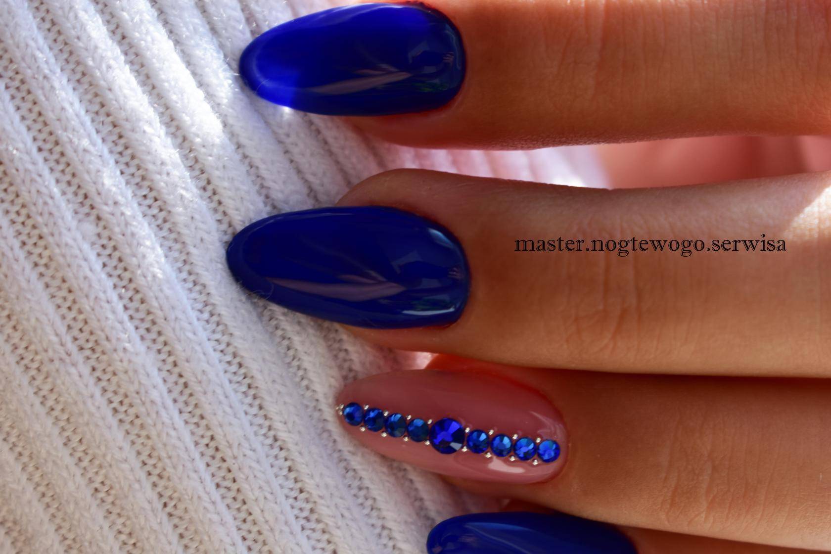 Вот некоторые примеры для вашего выбора. Синяя база, один ноготь под белым лаком, при чем оформлен камешками в тон. К «кошачьему глазу» подобрана отделка из бесцветных страз на избранном единственном пальце. Изюминкой для блестящей покраски на обеих руках послужит белоснежная роспись на одном ноготке с вставленными камушками.