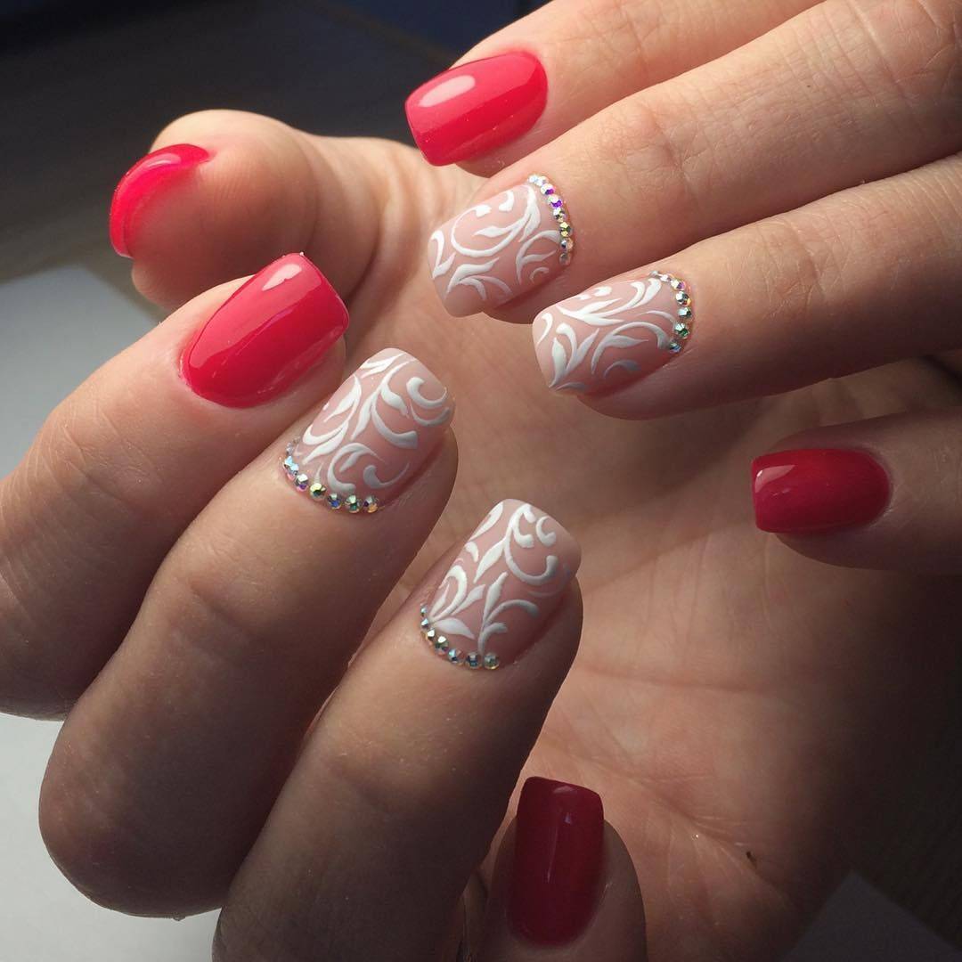 Двенадцатое место модного nail-ТОПа, делят между собой красный дизайн с украшением паутинкой и втиркой.