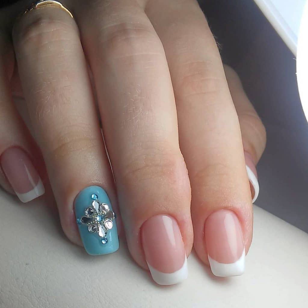 Недавно появился еще один способ, позволяющий разнообразить классический френч. Необходимо выложить на ногтевой пластине картину из камешков, к примеру, бантик или цветок.