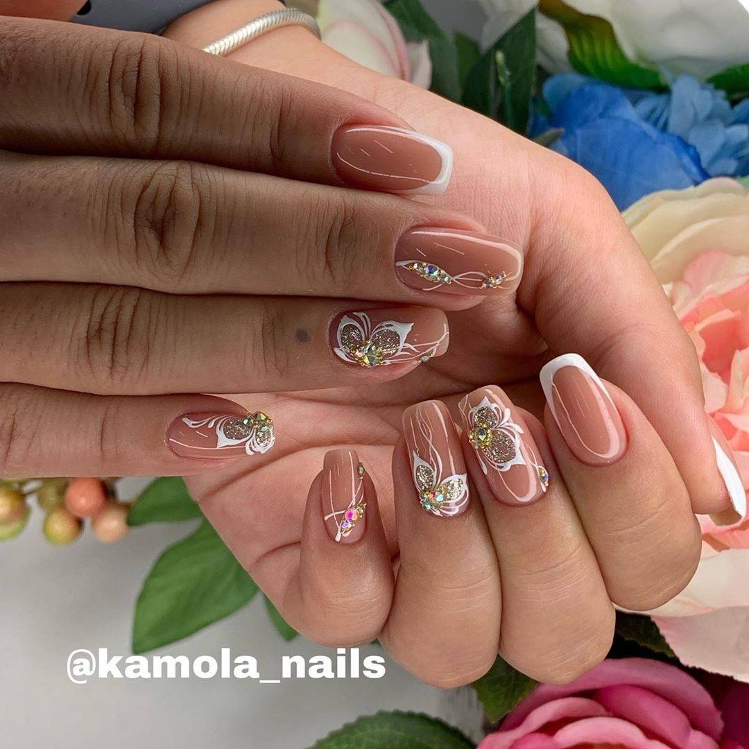Светлый маникюр всегда был универсальным, поскольку с его помощью можно воплотить в жизнь практически любую идею дизайна. Особенно летом пользуется популярностью изображение бабочек, инкрустированное стразами. В основном его наносят на один или два ноготка.