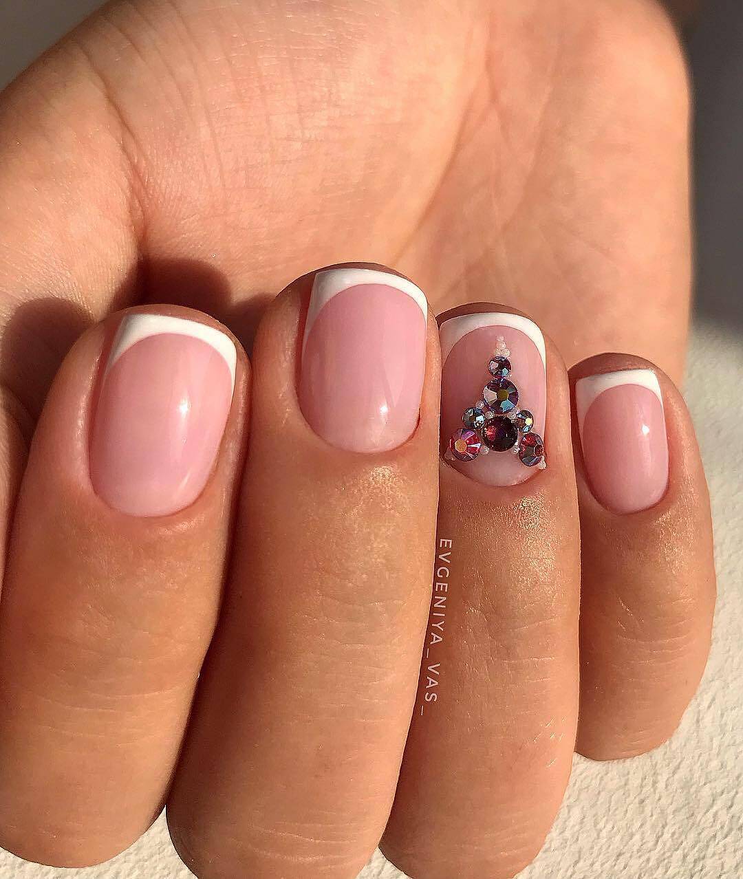 В светлых тонах также довольно часто делают френч и лунный маникюр. В сочетании со стразами он смотрится невероятно красиво и подходит для любого случая. Пожалуй, беспроигрышный вариант предполагает покрытие стразами безымянного ноготка. Альтернативным решением могут быть полоски страз вдоль ноготка со светлой линией улыбки. Нередко мастера выкладывают с помощью декора целые композиции. К примеру, веточки листьев или цветы. Отлично смотрится дизайн в виде снежинок или елочных игрушек.