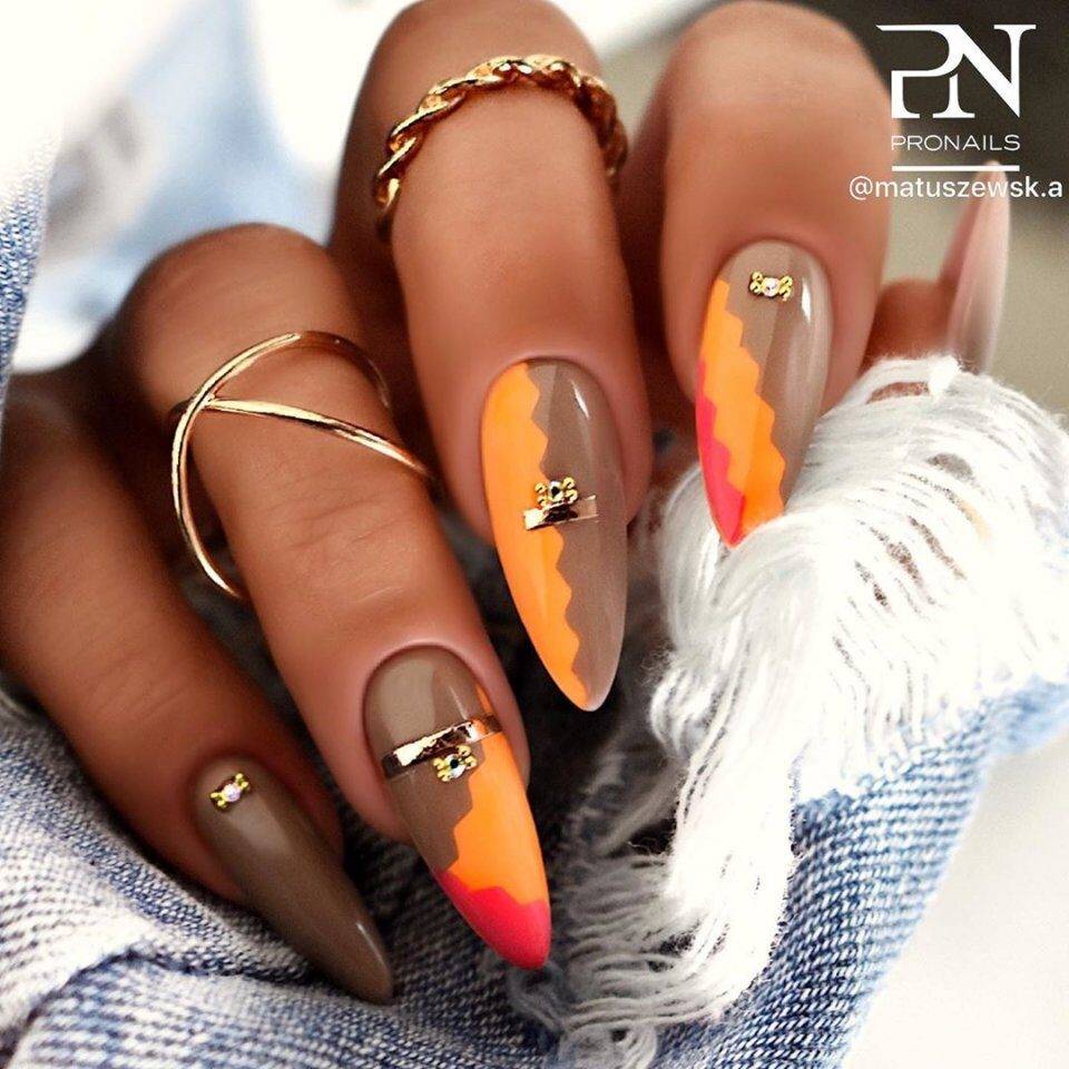 Модные тенденции предполагают использование золотистых декоративных элементов в каштановом маникюре, тогда дизайн смотрится гармонично и стильно. Среди возможных цветовых сочетаний можно выделить золотые лаки (жидкая фольга), а также теплые цвета: желтый, красный, оранжевый со всеми возможными оттеночными вариантами. Для интересного контрастного дизайна допустимо применять и холодные цвета: фиолетовый, синий, зеленый и т.д.