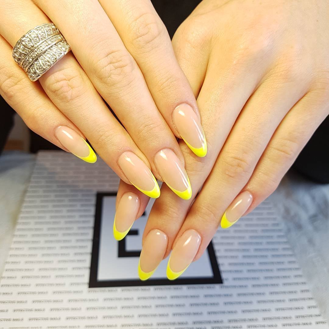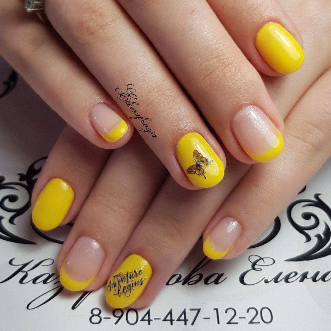 - С помощью желтой эмали (краски и кисточки, геля) прорисуйте френч на, предварительно покрытых базой, ногтях. Дождитесь полного высыхания покрытия.