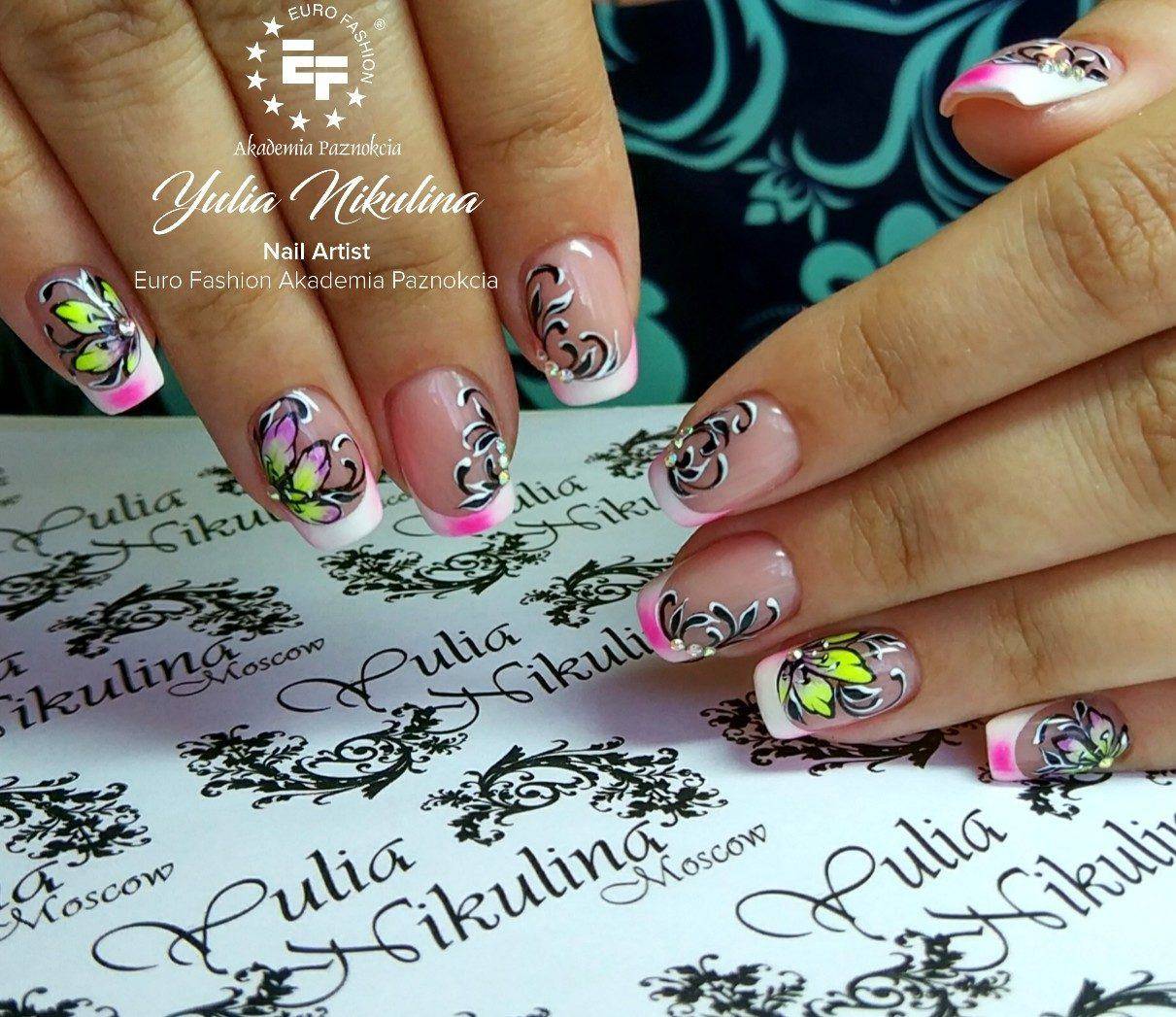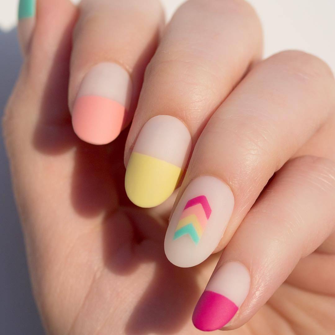 Красочные рисунки предполагают не только контрастные линии, но и цветной переход между ними. Для обозначения линии улыбки и линии дуги, мастера предлагают использовать различные цвета. Учитывая модные тенденции можно отдавать предпочтение оттенкам, выполненным в сезонной гамме. В тёплое время года модно использовать на ногтях цветочные, фруктово-ягодные и различные другие мотивы в ярких исполнениях. Осенью красиво расписывают ногти узорами на осенние мотивы. В зимний период актуальны снежно – новогодние мотивы, сверкающие и блестящие элементы.