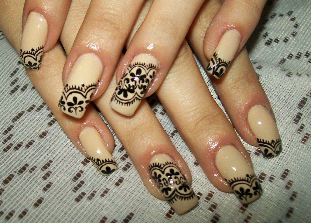 Работая по этой же схеме, добиться результата можно гораздо быстрее. Причудливые кружевные узоры продаются в магазине в виде готовых водяных наклеек. В этом случае, совсем не обязательно хорошо рисовать или тратить время на подбор тканевых кружевных рисунков. Сплести эти кружева самой себе можно уже на этапе покупки наклеек. Итак, на покрытые бесцветным лаком ноготки наносите выбранные узоры. Затем — защитный слой лака и сушка ногтей.