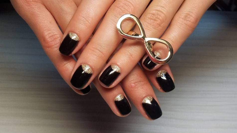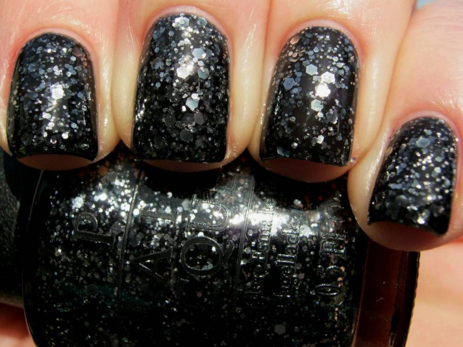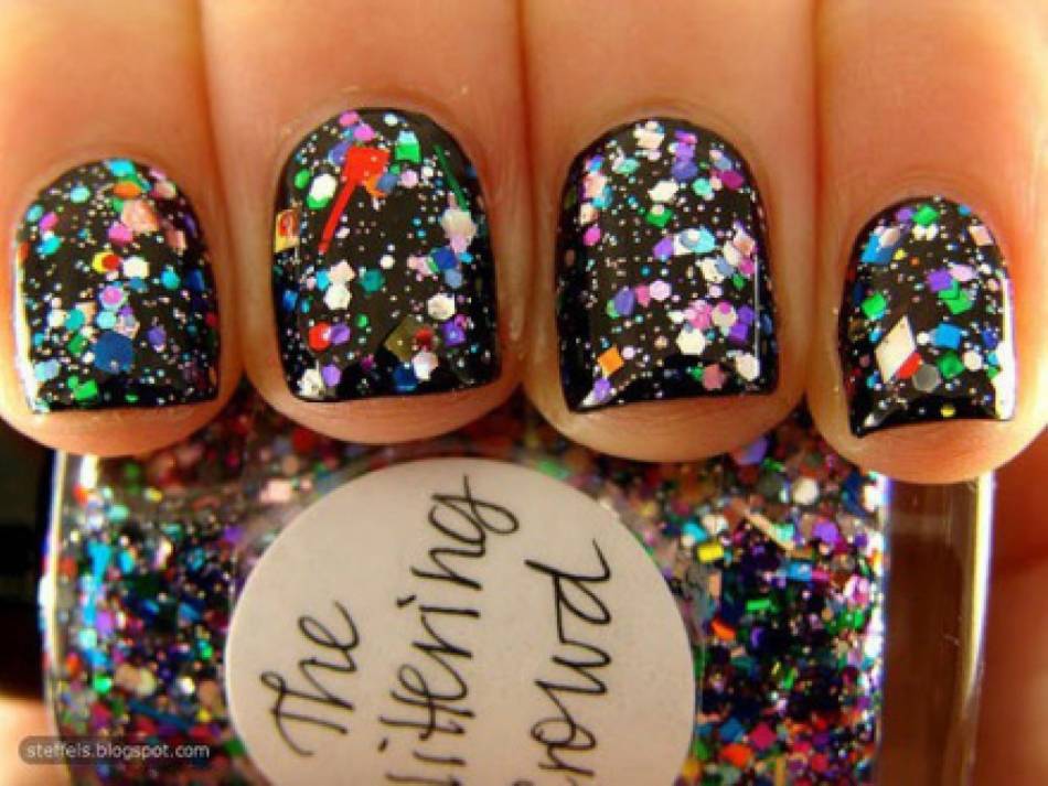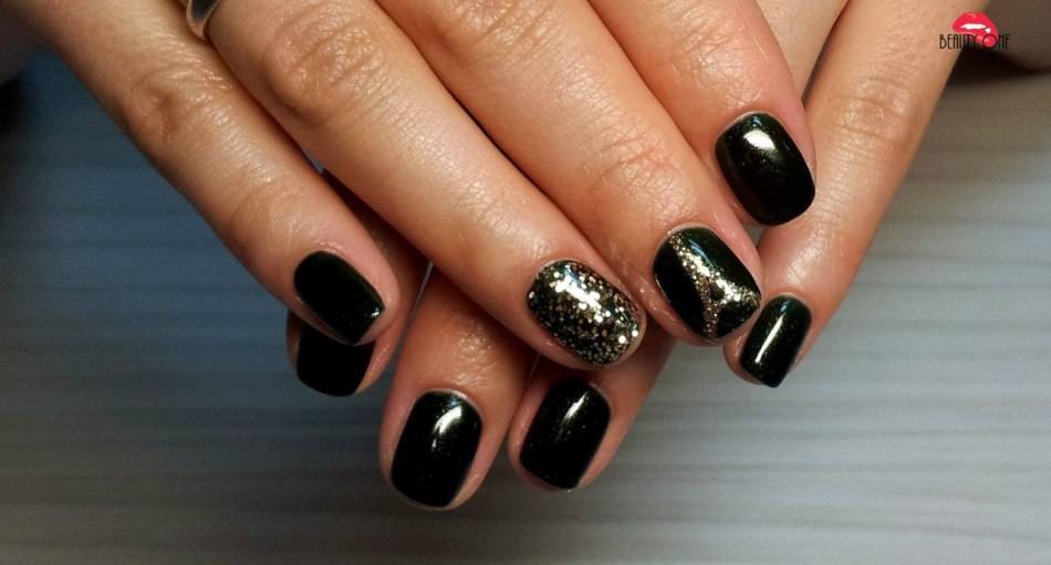Самый лучший базовый цвет лака для маникюра с блестками — черный. Он контрастно выделяет этот материал и позволяет использовать совершенно любой цвет блесток, даже черный. На черном лаке выгодно смотрятся, как крупные, так и мелке блестки. Их можно располагать разнообразными способами: хаотично, в определенных местах, сплошным слоем, линиями, россыпью, френчем и на отдельных пальцах.