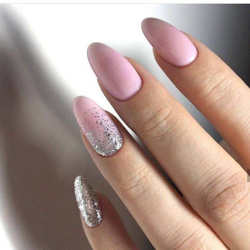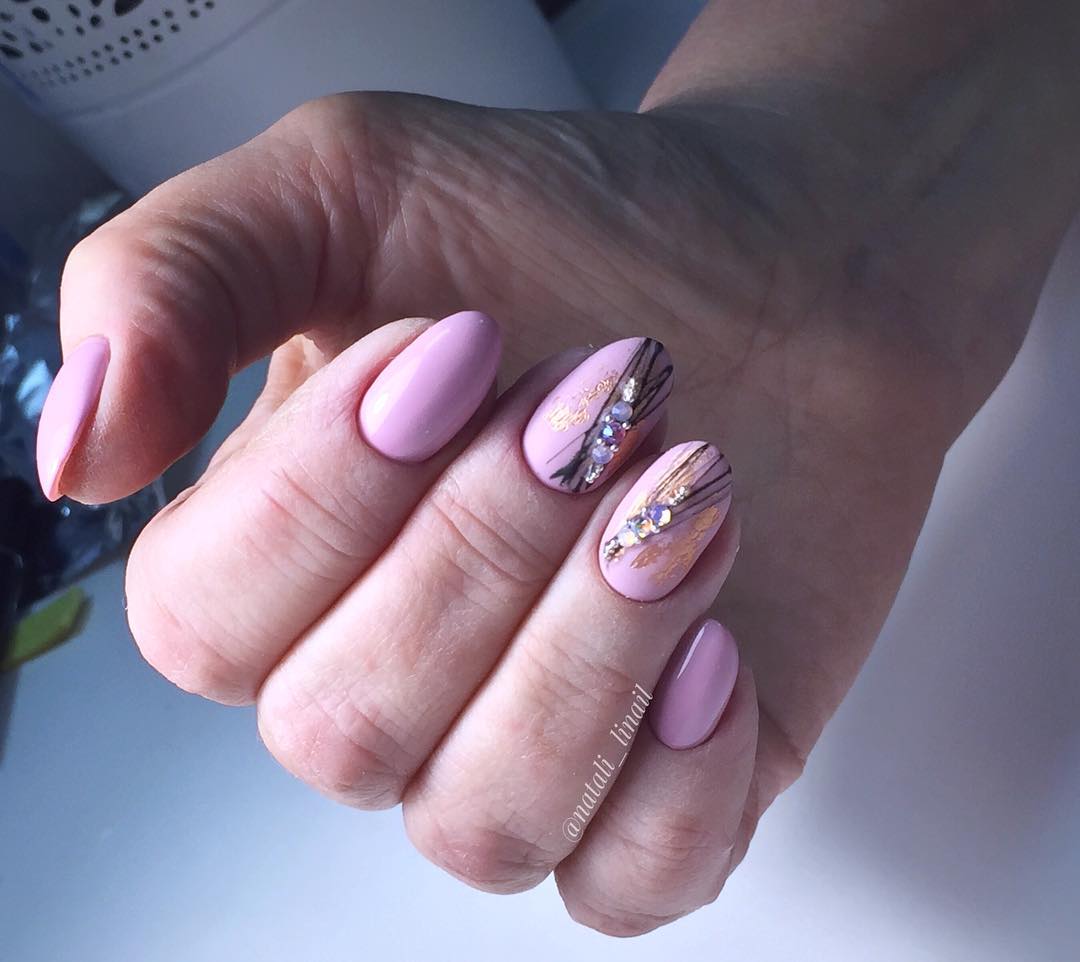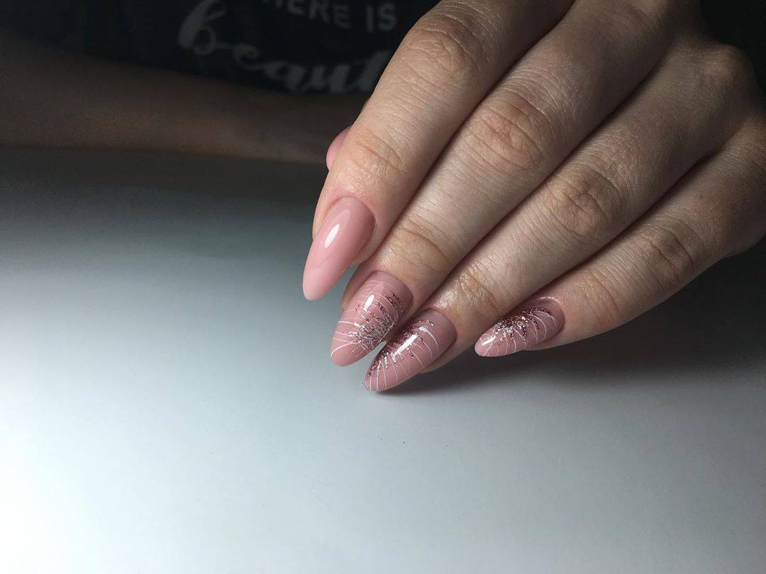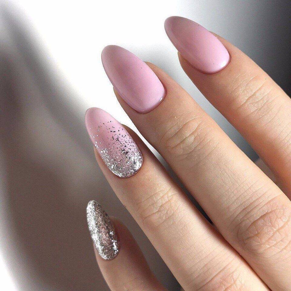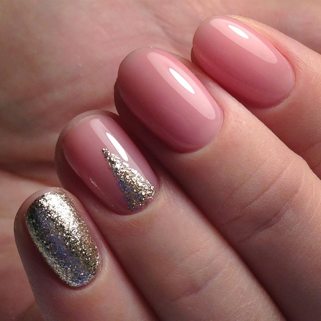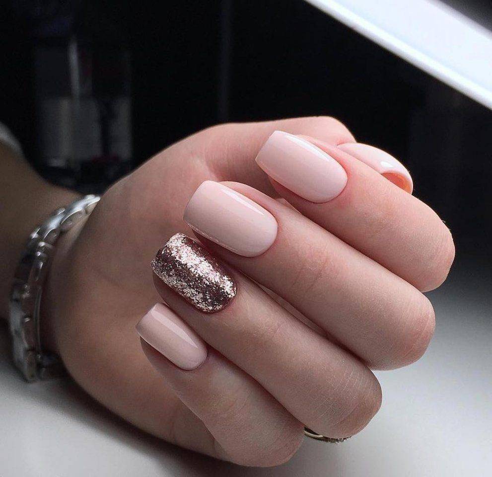 Праздничный — на пике популярности сегодня нейл-арт на прозрачном фоне. Можно сделать нежное розовое покрытие в 1 слой и нанести небольшое количество глиттера. Эффектно смотрится на указательном или безымянном пальце.