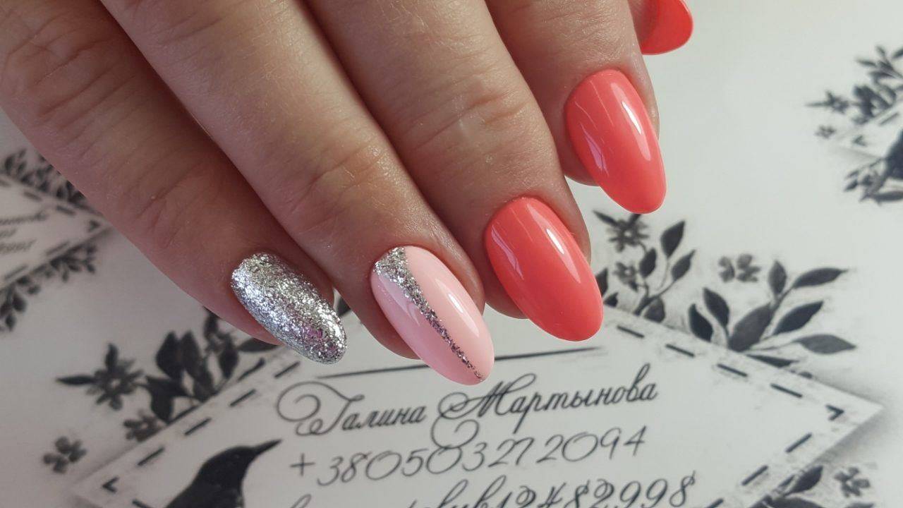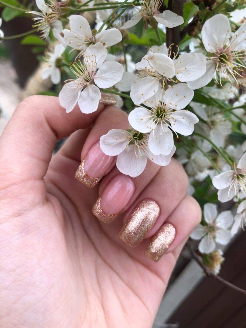 Мастера покрывают по типу френча кончики ногтей разного оттенка блестками. Это может быть персиковый цвет, пастельный, перламутровый…