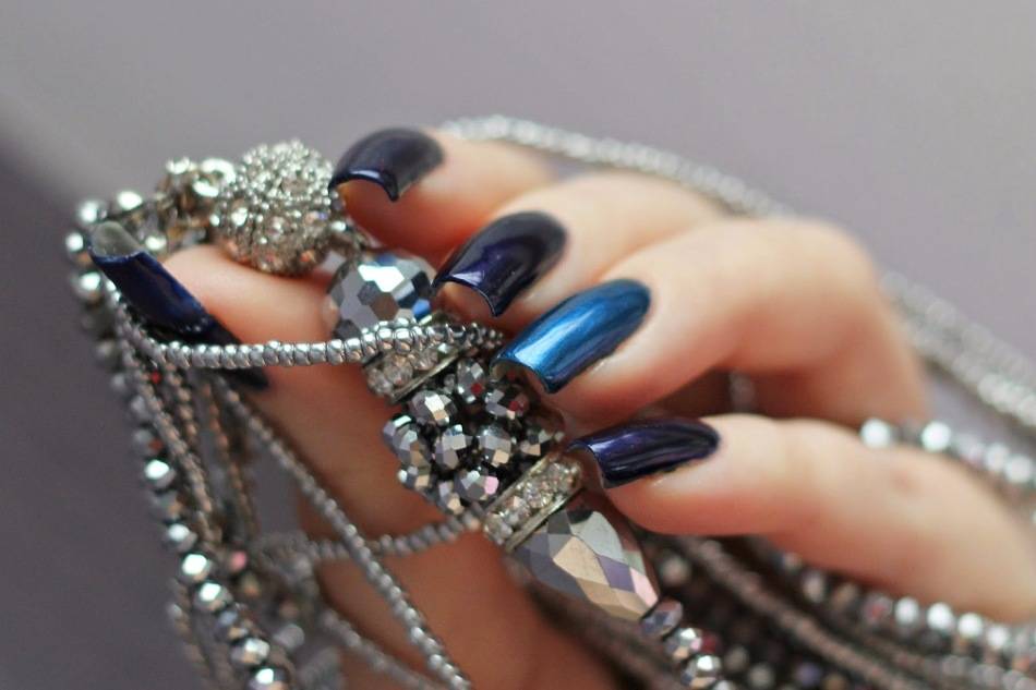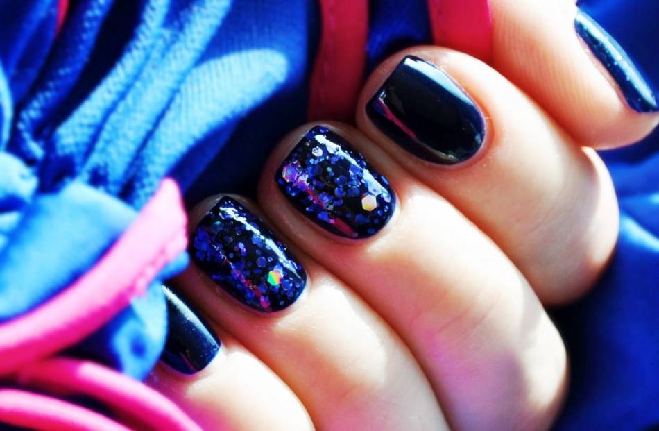 Важно лишь знать один момент: так как синий цвет относится к «холодному» цветотипу, то выбирать блестки следует, ориентируясь на этот факт. Если вы сделаете не правильный выбор, вы рискуете испортить впечатление от вашего маникюра и сделать его очень «дешевым» и не аккуратным на вид