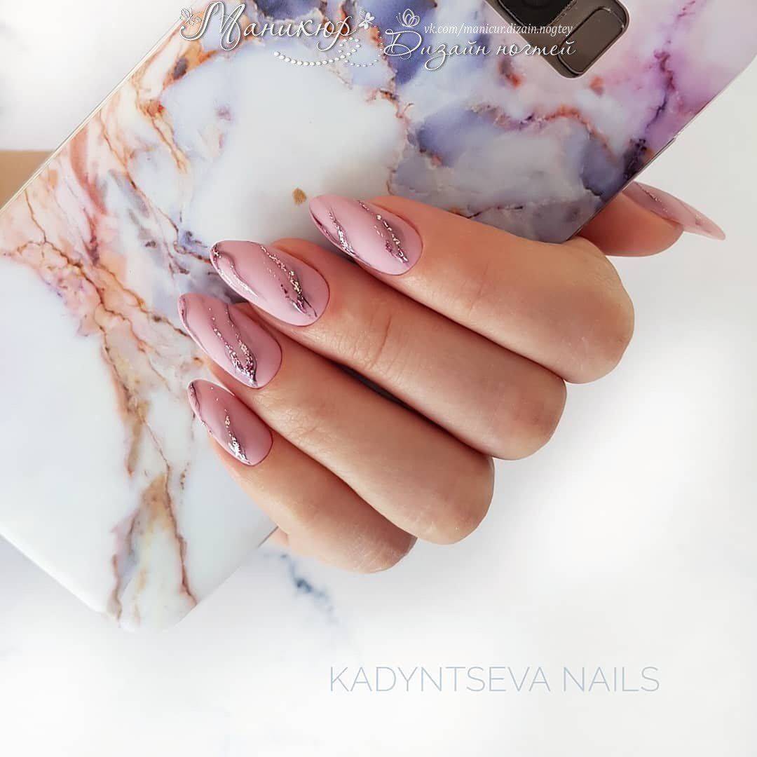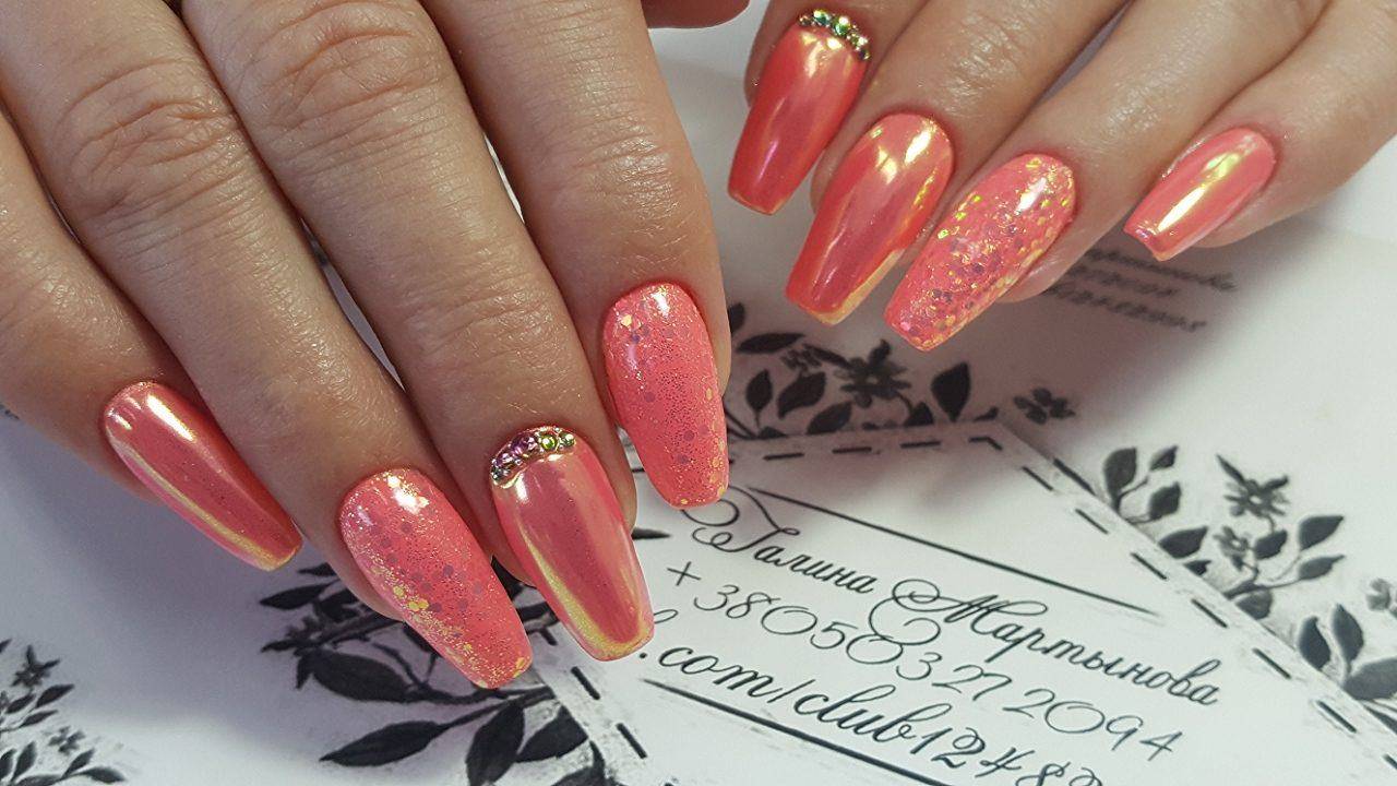 Блестящий маникюр 2019 — это прежде всего женственность. Теплые нежные тона — отличное решение для образа. Неплохо будет смотреться звездная пыль на кончиках пальцев.