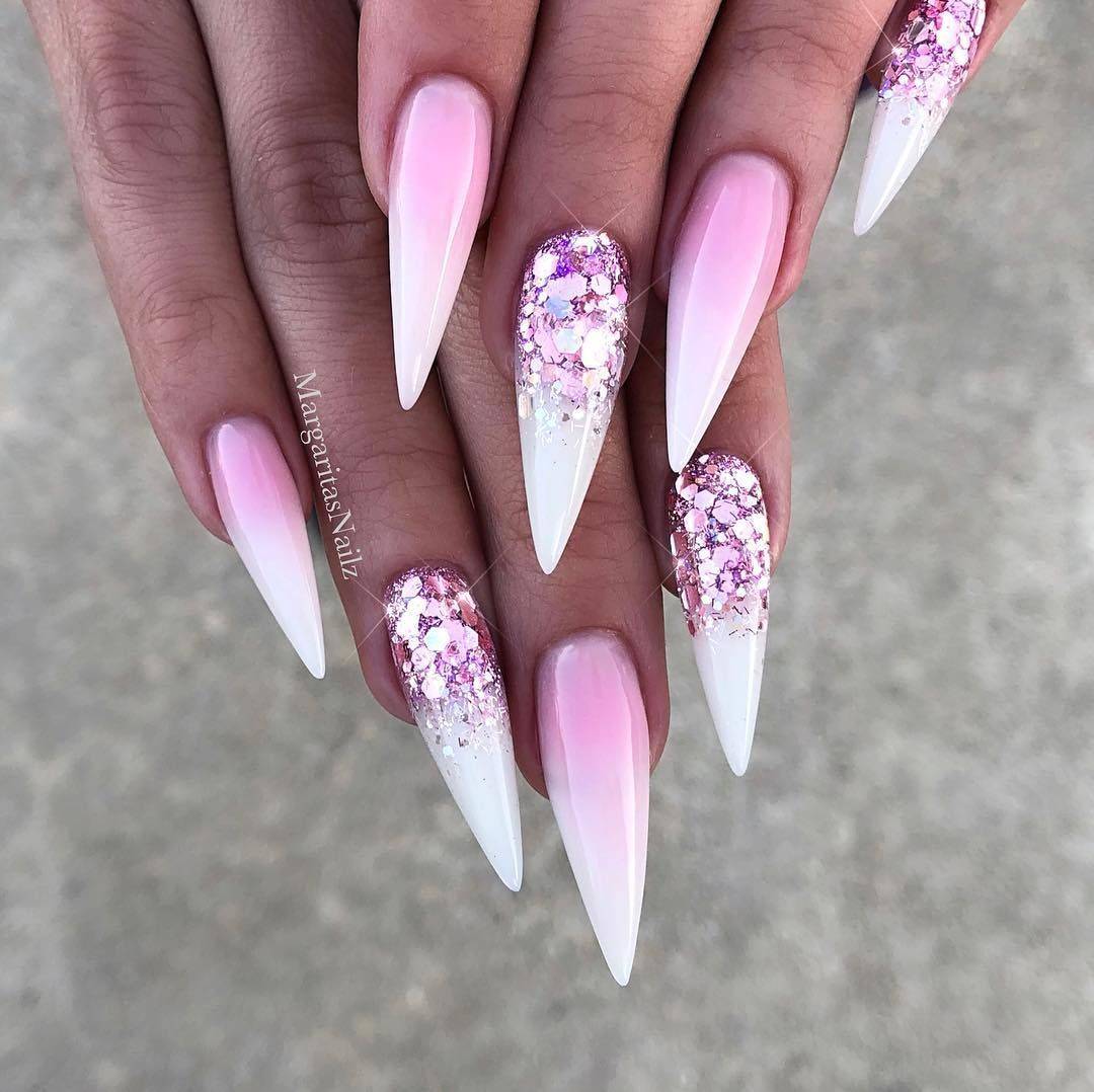 При выполнении маникюра на длинных ноготках всегда можно пофантазировать и воплотить в реальность самые невероятные идеи. При помощи различных блёсток можно создавать на ногтевых пластинах интересные узоры или выделять сиянием лишь часть ногтя. Френч, лунный дизайн и многие другие идеи являются в этом случае наглядным примером. Розовый маникюр с блёстками допускает использование как ярких, так и сдержанных оттенков, а также серого, белого или чёрного лака. Помимо блестящих дополнений также приветствуются рисунки, объёмные детали и комбинирование нескольких техник.