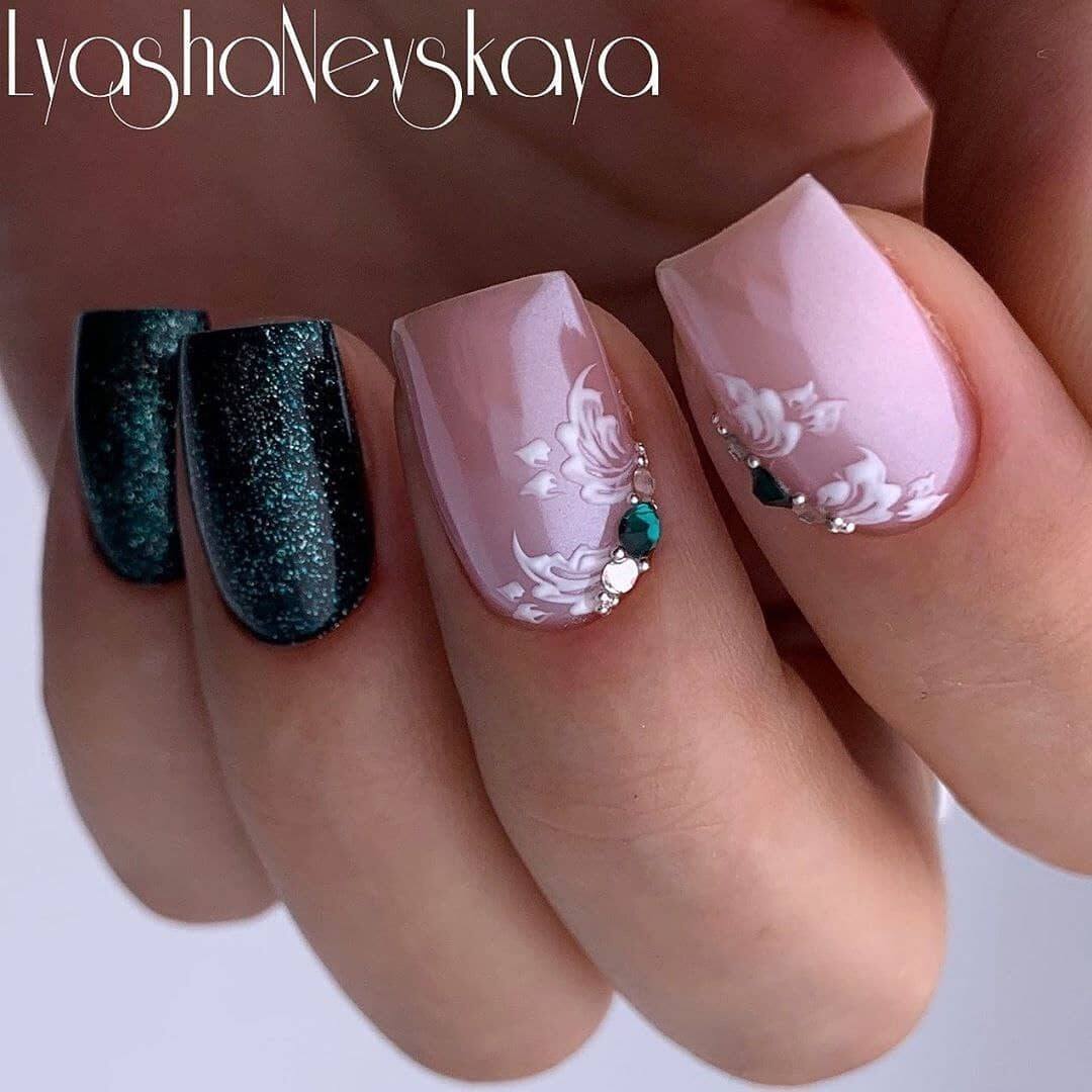 Женственность – это то, к чему стремятся все современные дамы. Подчеркнуть ее можно с помощью изумительного маникюра с флористическим дизайном. Тонкие веточки с листочками, изящные бутоны или крупные цветы – все это выглядит невероятно красиво независимо от того, какого цвета будет основное покрытие. Главное – подбирать оптимального размера изображение, чтобы оно дополняло и подчеркивало привлекательность маникюра. Блестки в данном случае играют немаловажную роль. Поскольку с их помощью можно украсить лепестки или сделать акцент на другой части рисунка.