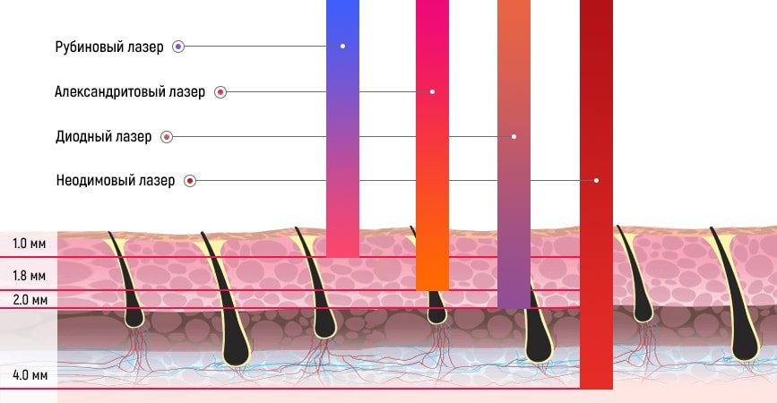 Чтобы понять, как влияет процедура на наше тело и что происходит с ним во время манипуляции, давайте узнаем, как действует лазер. Точечно направленный пучок световых волн проникает в определенное место, где расположены волосяные фолликулы. Лазер не действует на клетки эпидермиса, так как длина волн настроена на определенную глубину в 2-3 миллиметра, она влияет и затрагивает внутренний, а не внешний слой. Так что для большинства из нас однозначно можно исключить вред лазерной эпиляции.