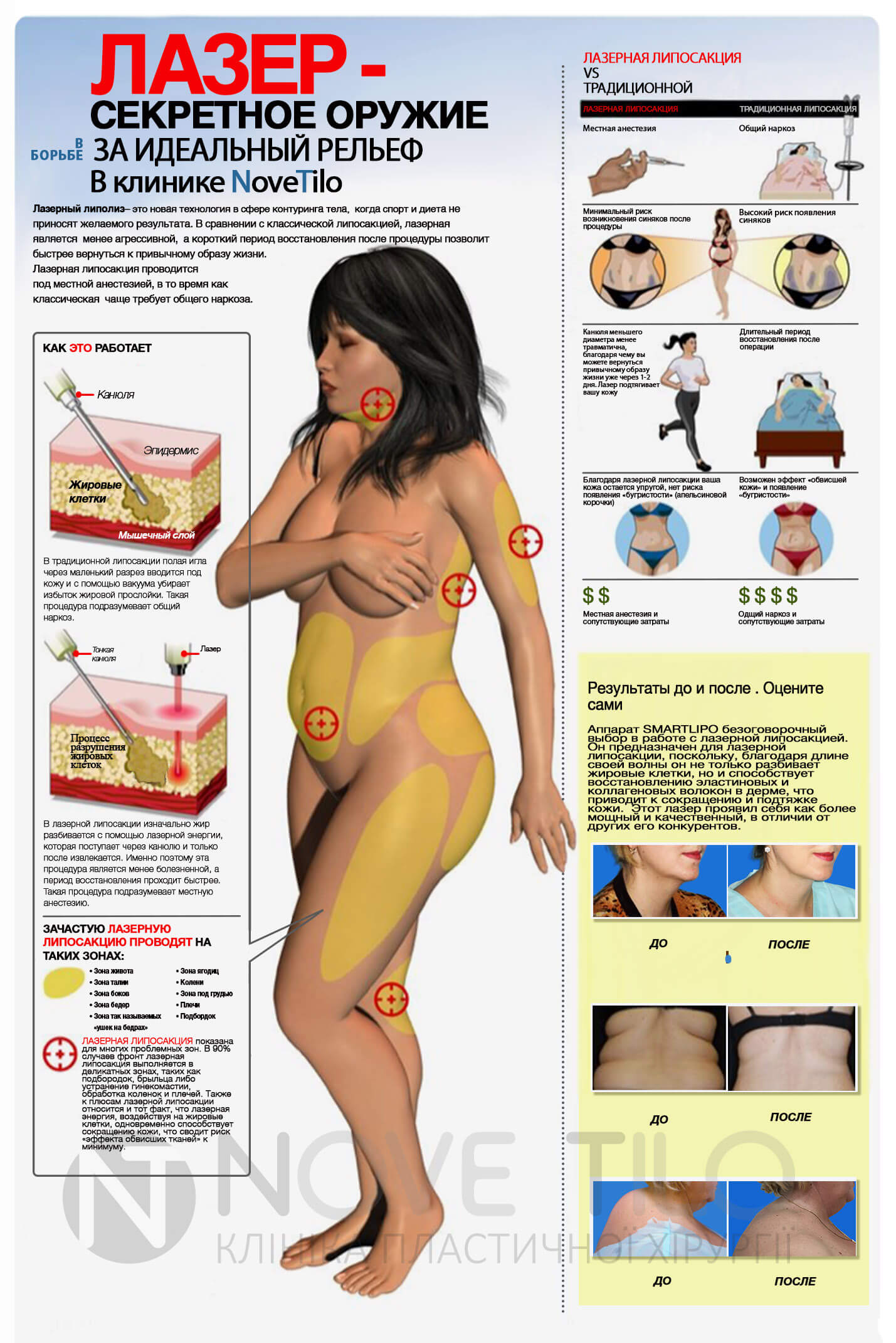 Лазерный липолиз – это эффективная процедура, но поможет она устранить небольшие объемы жировых отложений. Если требуется избавиться от более 3 л жира, тогда показана классическая липосакция или Vaser (Васер) липосакция.