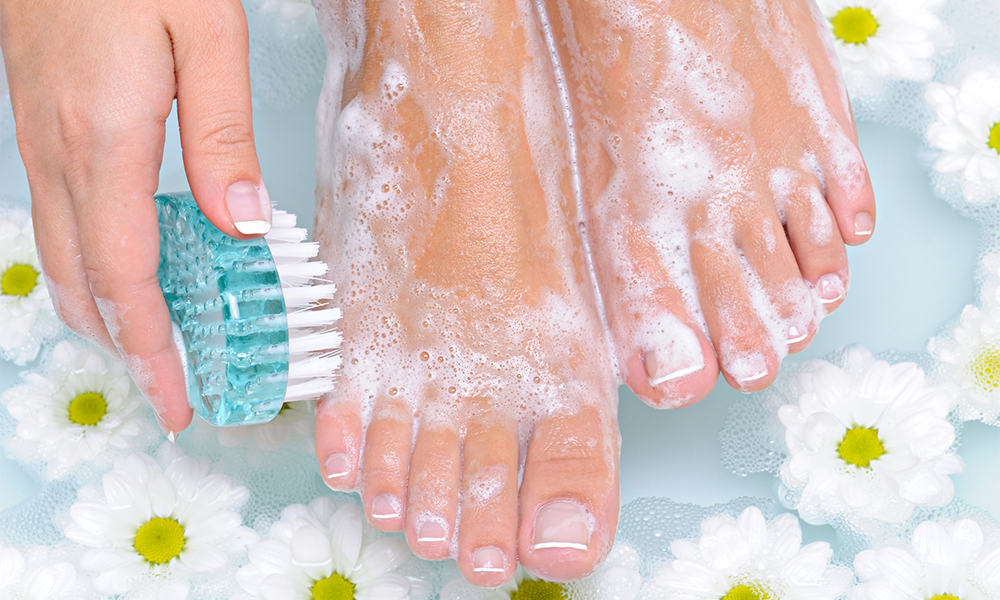 С помощью мыла либо другого моющего средства следует тщательно вымыть зараженные ногти. Специальной щеткой рекомендуется почистить поочередно каждый ноготок, что поможет устранить частички грязи от основания ногтевых пластин.
