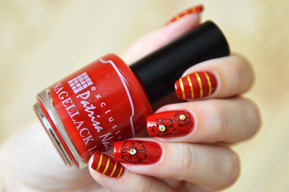 - Сверху нанести лак другого цвета, при этом желательно не прикасаться к декору, потом просто снять маникюрную ленту и высушить ногти надлежащим образом, в зависимости от покрытия.