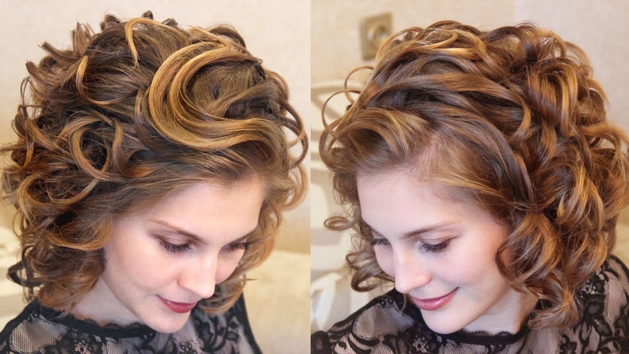 Стильная укладка локонами для коротких волос вьющегося типа идеально выглядит с боковым пробором и дополняется макияжем в золотисто-коричневых тонах