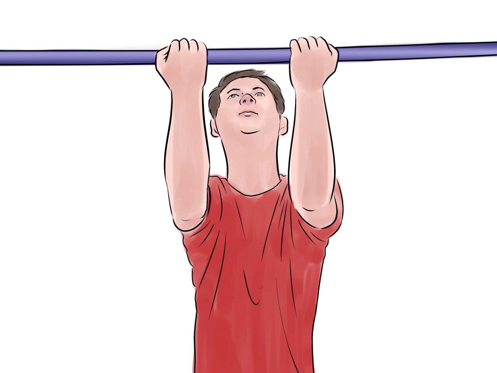 - Возьмитесь за турник прямым и в меру широким хватом.