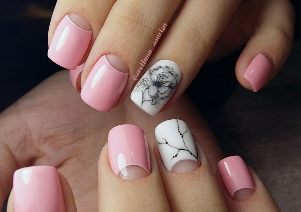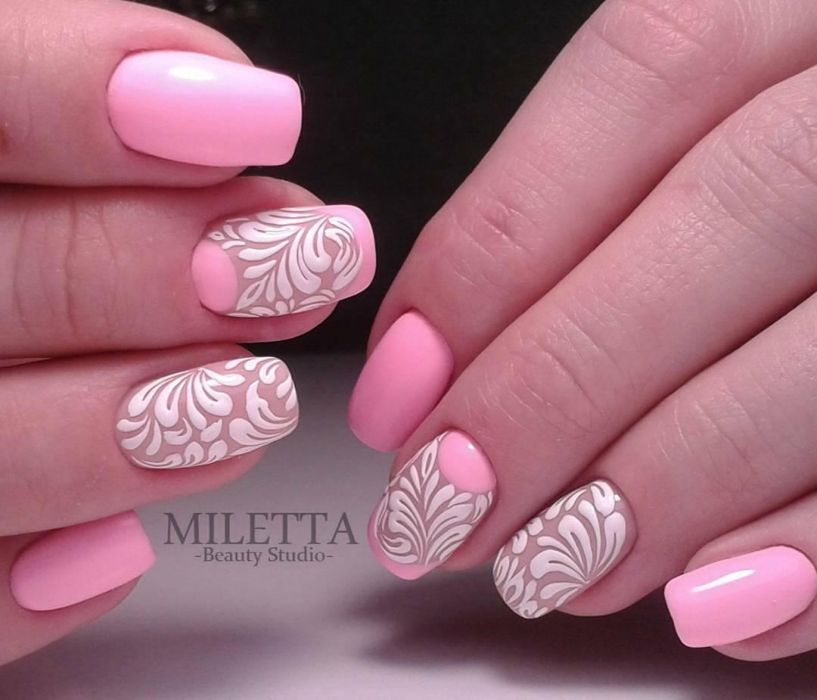 Розовый, впрочем так же как и бежевый, является универсальным цветом для повседневного маникюра. Он незаменим для оформления коротких ногтей, т.к. светлые оттенки зрительно удлиняют ногти. Розовый – цвет весны и лета. От сочетается с цветочными орнаментами и вензелями. При желании можно сделать и геометрический рисунок, например выложить его фольгой “битое стекло”, она очень стильно смотрится на розовом гель-лаке.
