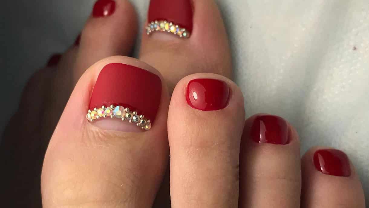 Использование матовых лаков в лунном педикюре считается достаточно выигрышным решением. В зависимости от цвета данный вариант хорошо послужит в качестве нарядного оформления, а также замечательным летним выбором. Матовое покрытие придает оттенкам более насыщенный и изящный вид.