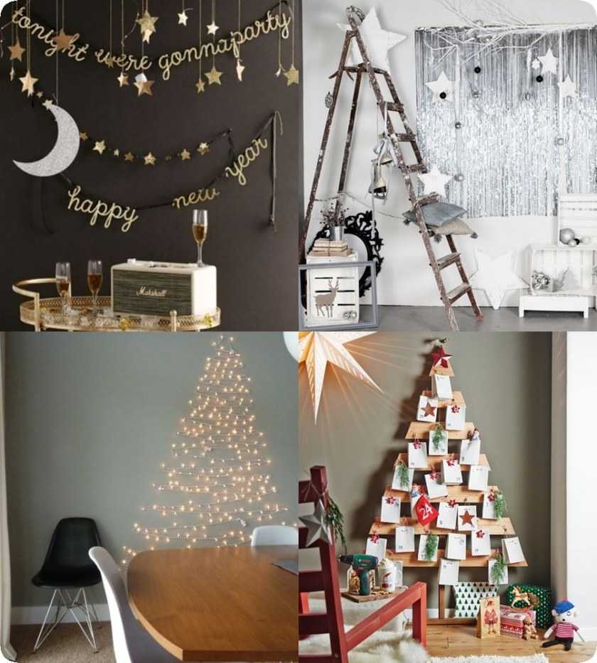 Для большей красочности можно подвесить ёлочные игрушки на верёвочках или прикрепить подарочные бантики, вырезанные из бумаги снежинки, гирлянды со светящими лампочками.