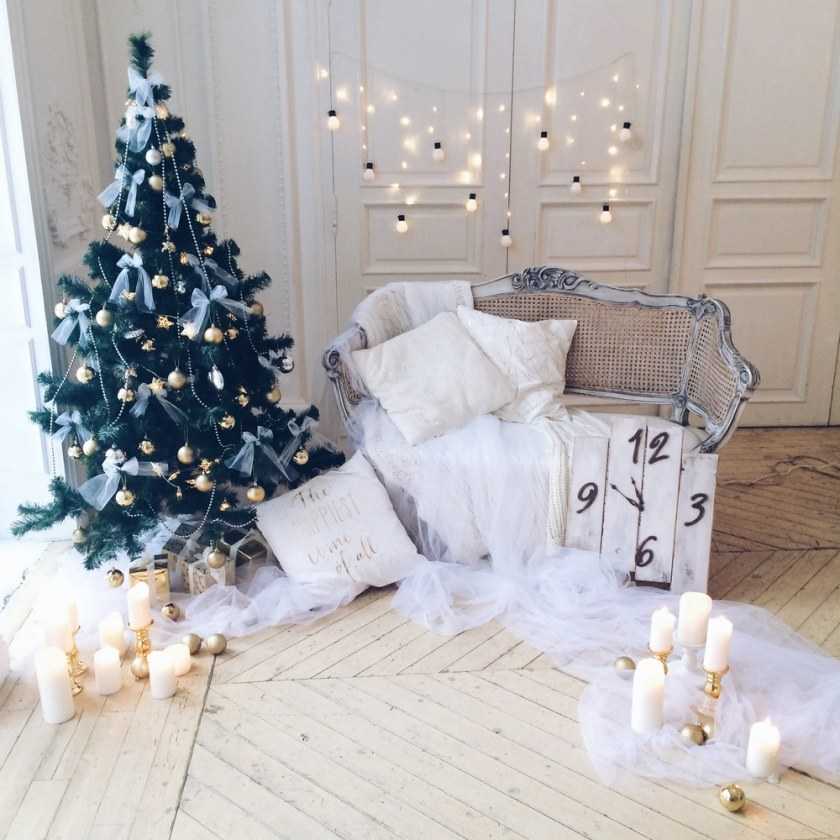 Фотозона из ёлочных шаров на Новый год своими руками смотрится особенно нарядно и богато. Игрушки можно развесить на нитках разной длины перед панорамным окном, либо прикрепить к нарядной однотонной шторе. Можно экспериментировать с цветовой гаммой шаров, чтобы подобрать идеальную для красивых фотографий.