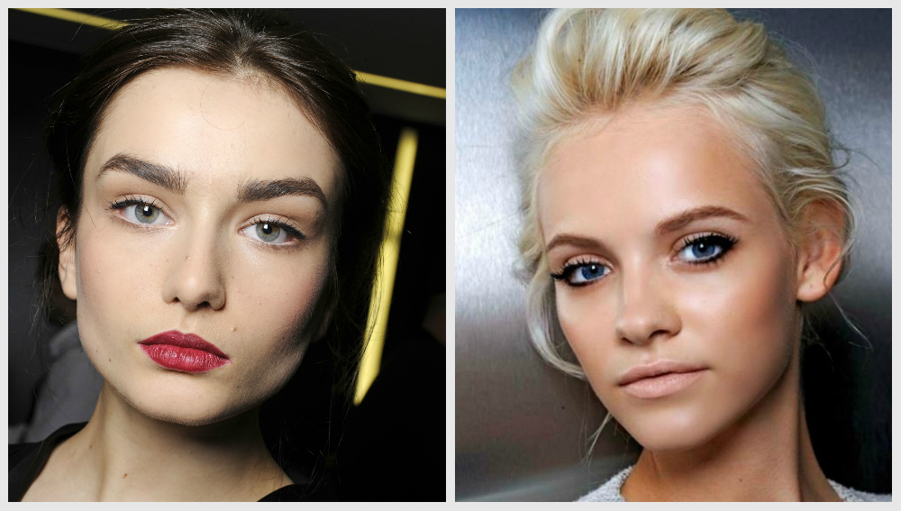 Залог красивого и модного макияжа – оформление бровей и стробинг. Сначала делаем глаза выразительней с помощью бровей: если они будут естественными, в меру широкими и с лёгким изгибом, то лицо будет выглядеть не столь узким. Волоски причёсывают щёточкой, аккуратно наносят специальные тени или тушь. Потом можно поиграть с хайлайтерами, если делаем стробинг. Контуринг здесь не подойдёт – лицо будет смотреться ещё более худым.
