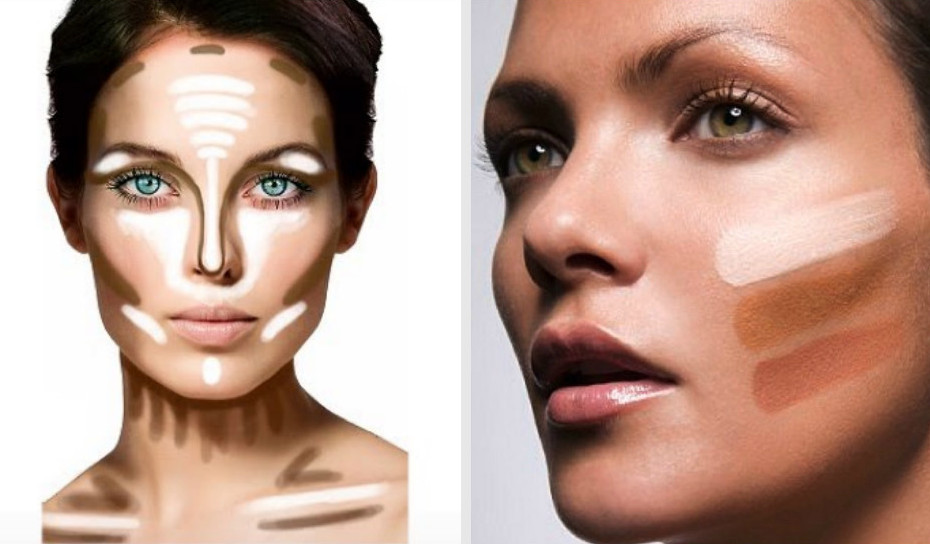 Вам понадобится специальная палетка со светлым и темным оттенком бежевого цвета или отдельно хайлайтер для высветления и бронзер для затемнения участков лица. Нанесите темный оттенок на лоб вдоль линии роста волос, на нижнюю челюсть и на нижнюю часть скул. Светлый оттенок наносим на середину подбородка, переносицу, под глаза, на участок лба между бровями.