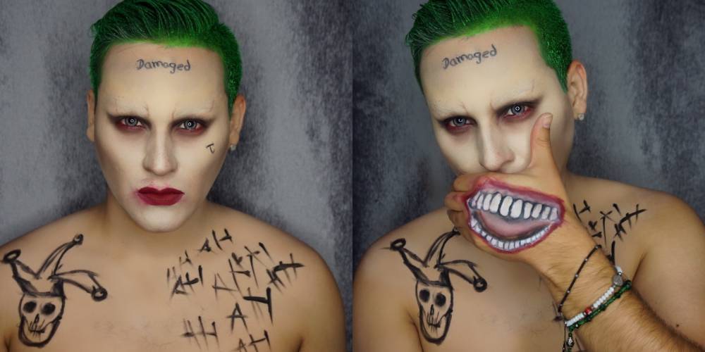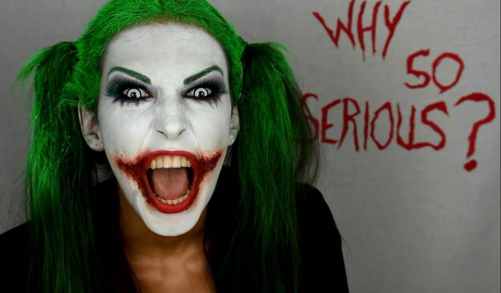 Для Джокера характерны зеленые волосы и выбеленное лицо. Также необходимо загримировать брови, ведь в фильме у злодея они отсутствуют. Далее вооружитесь черным карандашом для век и нарисуйте синяки под глазами. Самая узнаваемая черта Джокера – ужасающая улыбка. Нарисуйте ярко-алые губы, не бойтесь выходить за пределы природного контура.