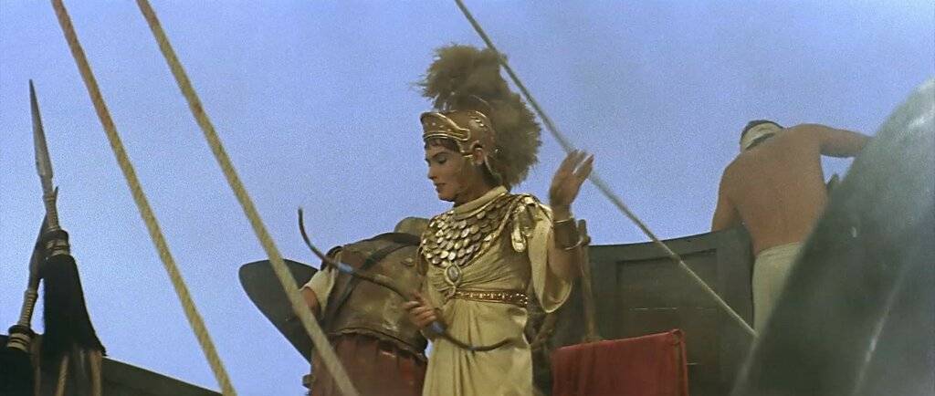 Перед битвой она наряжается практически Афиной Палладой, в шлеме и костюме греческой богини (вы еще помните, что реальная Клеопатра из греко-македонской династии Птолемеев?). И кстати, смотрится в этом наряде гораздо естественней Зены-королевы воинов.