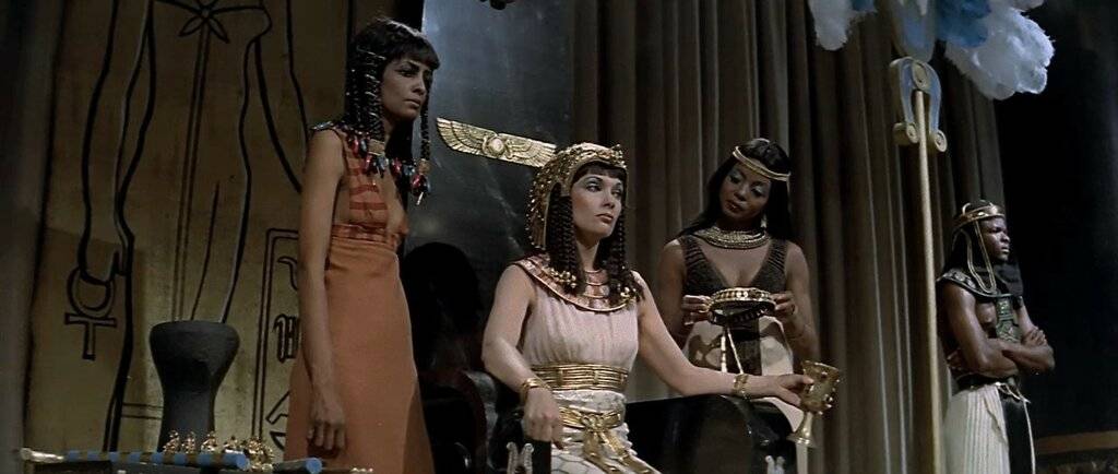 Одно из них, «домашнее», стилизовано под египетское, даже обувь выглядит аутентично, но современные трусики танга и бюстгальтер на царице — это даже для кино перебор!