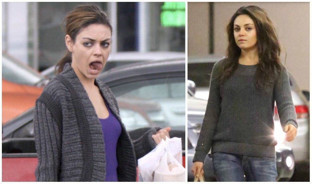 На красных дорожках Мила Кунис выглядит всегда восхитительно, благодаря грамотно подобранным нарядам на отличной фигуре, правильному макияжу и, постоянно присутствующей на ее лице, улыбке. Однако, в повседневной жизни звезда превращается в другого человека, предпочитающего бомж-стайл и отсутствие косметики на лице.