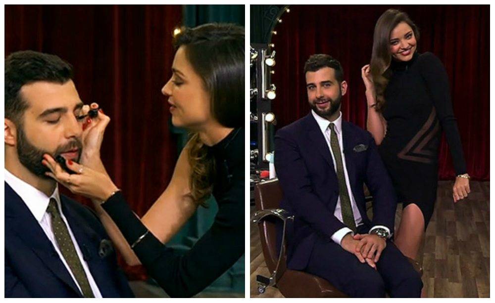 Недавно Miranda Kerr посетила Россию и успела побывать в гостях у Ивана Урганта, приняв участие в съемках передачи “Вечерний Ургант”. В свойственном для Ивана стиле он предложил девушке поучаствовать в эксперименте под названием: “Ты накрась-накрась меня, Миранда”, выступив в роли модели для Миранды лично. За отведенные условиями эксперимента 2 минуты девушка исполнила на лице Ивана макияж, с которым Ургант мог бы победить в конкурсе самых красивых телеведущих.