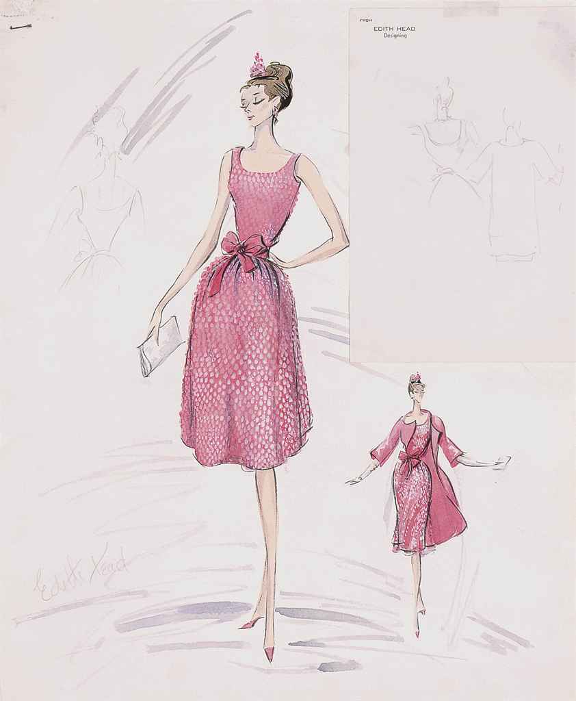 Розовое платье Холли Голайтли — Одри Хепберн из фильма «Завтрак у Тиффани» (“Breakfast at Tiffany’s“, 1961) Блейка Эдвардса, как и ключевые наряды героини, — дело рук французского дизайнера Юбера де Живанши. Это шелковое коктейльное платье, расшитое пайетками и желтыми кисточками, с розовым бантом вокруг талии Холли надевает вместе с легким атласным пальто и туфлями в тон. Из украшений на ней — блестящая детская розовая диадема и серьги, аксессуары — блестящий белый клатч и бандерилья (разноцветные копья-гарпуны, которые втыкают в спину быка во время корриды, чтобы «развеселить» его).