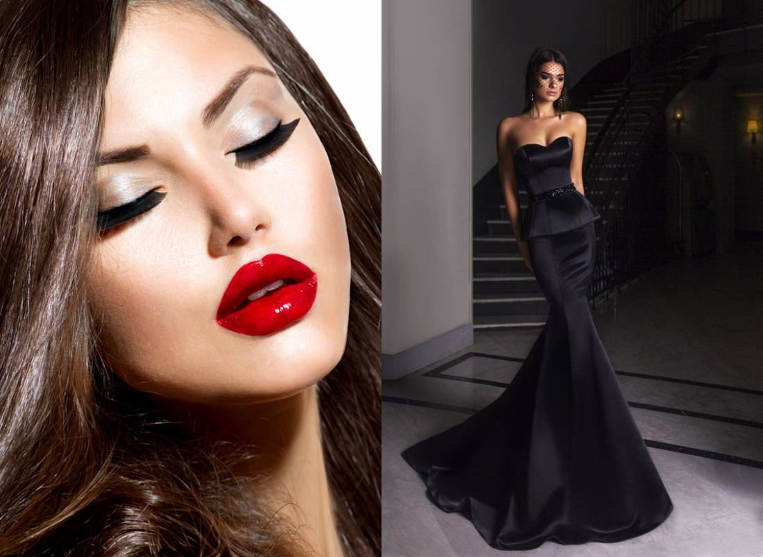 Самое основное правило – темнота платья не должна поглотить ваше лицо. Именно лицо в вашем образе, а не платье должно превалировать. Тон вашего лица должен быть идеален, поэтому внимательно отнеситесь к выбору основы. Из теней лучше всего предпочтение отдать тем, которые имеют металлический оттенок. В вечернее время можете воспользоваться помадами красных оттенков.