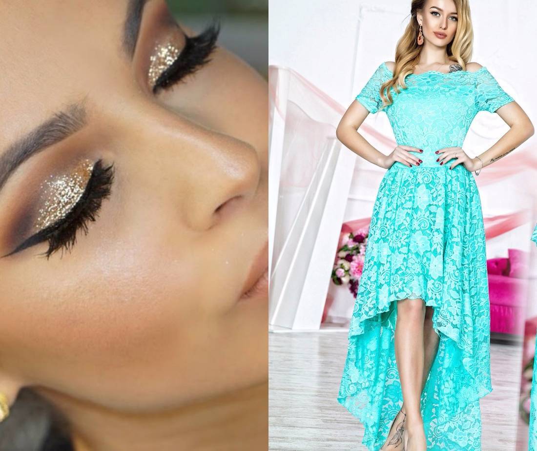 - С романтическим платьем акцент в макияже лучше сделать на блеске глаз, в прямом смысле использовать блестки вместо теней и глянцевый блеск для губ. Например, к васильковому, нежному голубому, цвета мяты или к платью с цветочным принтом лучше выбрать золотые тени и губы цвета фуксии. Лавандовое платье лучше сочетать с помадой молочного цвета. Платье в греческом стиле отлично будет смотреться с пудровой помадой.