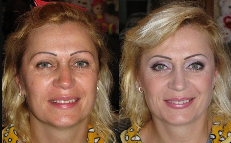 Сравните облик женщины до макияжа и после.