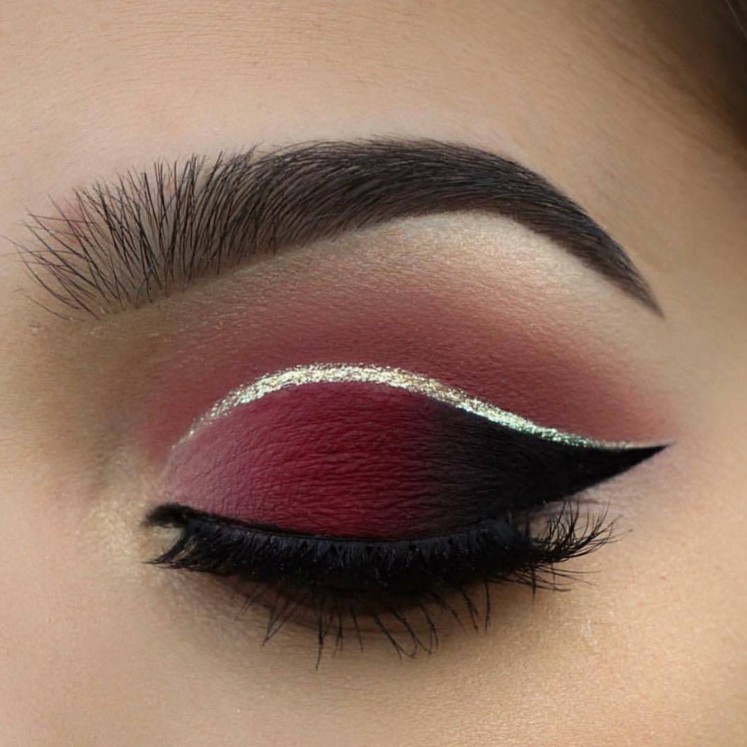 В качестве основного цвета на подвижном века выбирайте бордовые тени с сатиновым или шиммерным финишем – полностью матовый оттенок, нанесенный на эту область век, может придать глазам болезненности, особенно если речь идет о светлом цвете глаз. Такой эффект получается из-за возникающей ассоциации с воспаленной кожей вокруг глаз – в таком состоянии она действительно матовая. Шиммер же уводит от этой ассоциации, сообщая о том, что на веки нанесен интенсивный, возможно праздничный макияж.