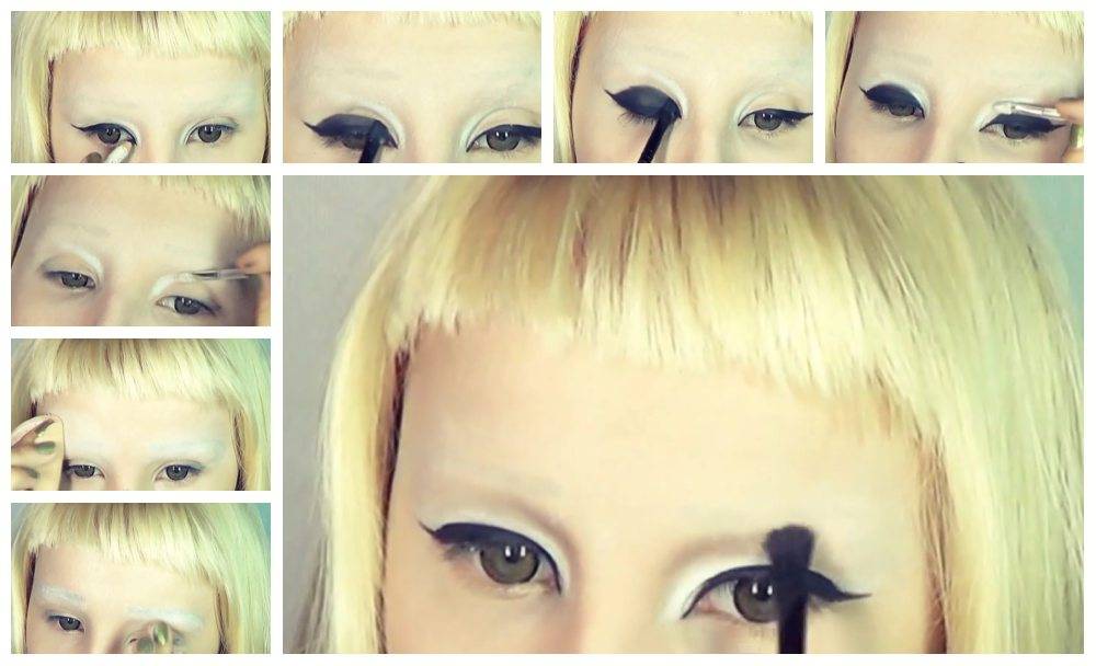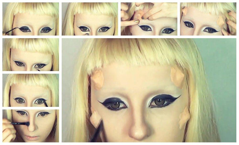 Вооружившись всем необходимым можно создавать макияж в стиле Леди Гага. Начинаем с нанесения тонального крема и выравнивания тона лица. После этого пошагово выполните первый этап: