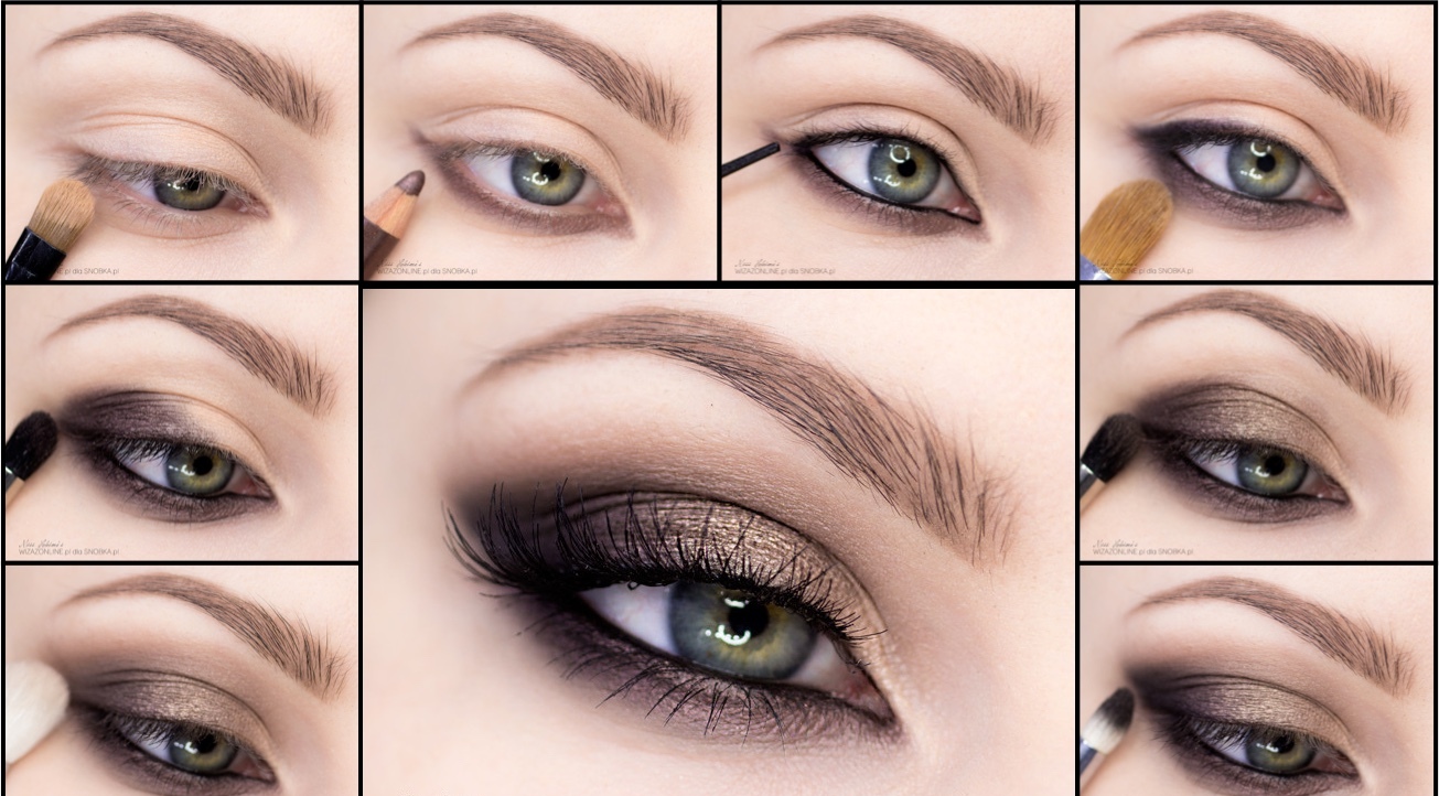 Начинаем с формирования линии бровей. Для этого подбирайте карандаш, который не будет диссонировать с общей цветовой гаммой макияжа и цветом волос;С помощью тонального крема делаем основание под макияж. Можете использовать обычную пудру, но только под нее наносите питательный крем для век, чтобы не высушить кожу.Верхнее веко над ресницами до складки. Старайтесь распределить средство так, чтобы в середине и у внутреннего угла века тени легли тонким, полупрозрачным слоем, делая его более насыщенным к внешнему.Берем следующие тени, которые на тон темнее предыдущего. Их распределяем на внешнем уголке верхнего века по всей плоскости до складки и дальше до центра. Многие применяют для растушевки кисточку, но есть умельцы, которые все могут сделать с помощью подушечек пальцев;Мягким карандашом для глаз обводим контур вдоль линии ресниц;Берем самые темные тени (или карандаш для «смоки»), и проводим толстую линию чуть выше рисунка карандаша;По направлению от внутреннему углу глаза к внешнему, аккуратно растушевываем границы темных цветов с помощью кисти или подушечек пальцев;На внешнем углу глаза прорисовываем уголок с помощью карандаша. В этот момент глаз должен быть открыт;Плотным черным цветом обводим нижнее веко по линии ресниц. Старайтесь, чтобы линия была четкая, но аккуратная;Теми же движениями, с помощью кисти или пальцев, растушевываем карандашный набросок от внутреннего угла глаза к внешнему;В заключении берем мягкую кисточку с закругленным краем, и аккуратно заканчиваем растушевку цветов от самого темного к светлому по направлению от внутреннего уголка к внешнему;Ресницы подкрутите с помощью щипчиков, и подкрасьте темной, объемной тушью в два слоя.