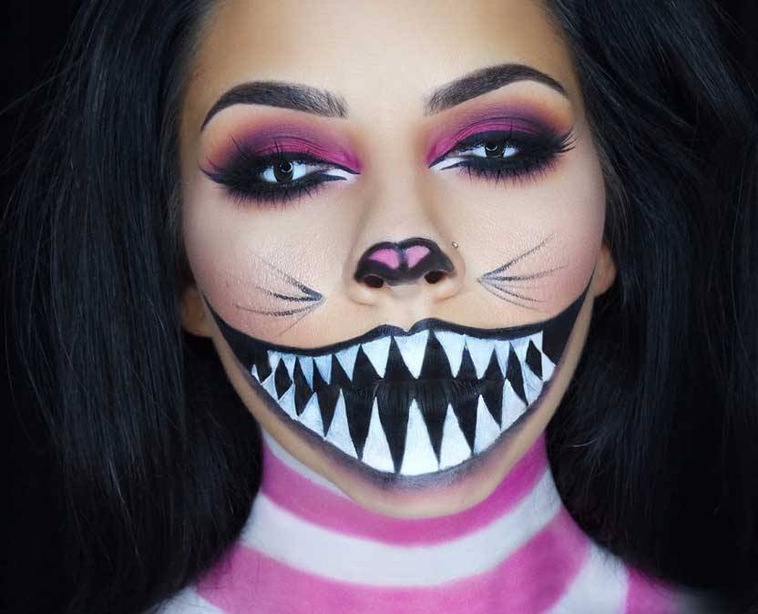 Часто девушки выбирают образ кошечки или другого представителя этого семейства. Это неудивительно: ведь кошки – грациозные создания. Но не менее популярен на Хэллоуин Чеширский Кот из «Алисы в стране Чудес». Самое сложное в создании образа Чеширского Кота – это его улыбка.
