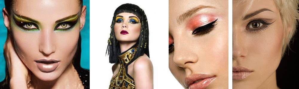 Разнообразие теневых оттенков для глаз в этом макияже ни к чему. Используют только два цвета: коричневый и перламутрово-золотистые. Следует создать градиент на подвижном веке: сначала используем перламутрово-золотистый оттенок, который плавно переходит в коричневый и тянется до самых бровей. Стрелки имеют выраженную особенность – они должны постепенно утолщаться и выходить за границы внешнего уголка подвижного века. Тушь наносится в несколько этапов для создания густоты и объема.