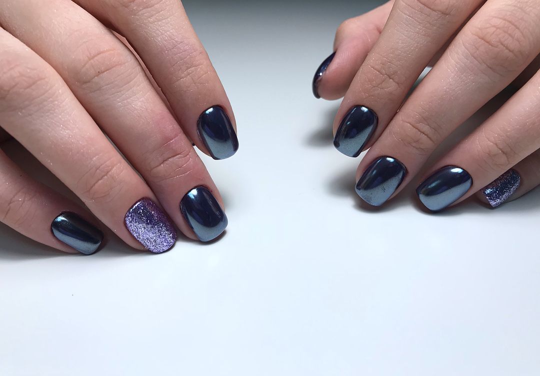 Чёрный лак на ногтях уже давно не ассоциируется с неформальными субкультурами, смотрится очень сдержанно и в модном сезоне 2021 считается признаком элегантности. Он прекрасно сочетается со многими известными техниками оформления и чудесно смотрится с украшениями и декором. Втирка в нашем случае, также не является исключением. Вы даже не представляете себе, насколько богато и шикарно выглядит такой тёмный маникюр с переливами пудры. Это может быть вариация однотонного нейла с блестящими переливами на каждом ноготке, комбинированный дизайн с блестящими и матовыми ногтями, маникюр с втиркой и рисунками или примеры нанесения пигмента в виде переходов градиента, когда на ногтевой пластине используется несколько цветов акриловой пудры. Не смотря на некую мрачность и бесконечную глубину, чёрный лак можно назвать идеальной базой для создания подобного дизайна.