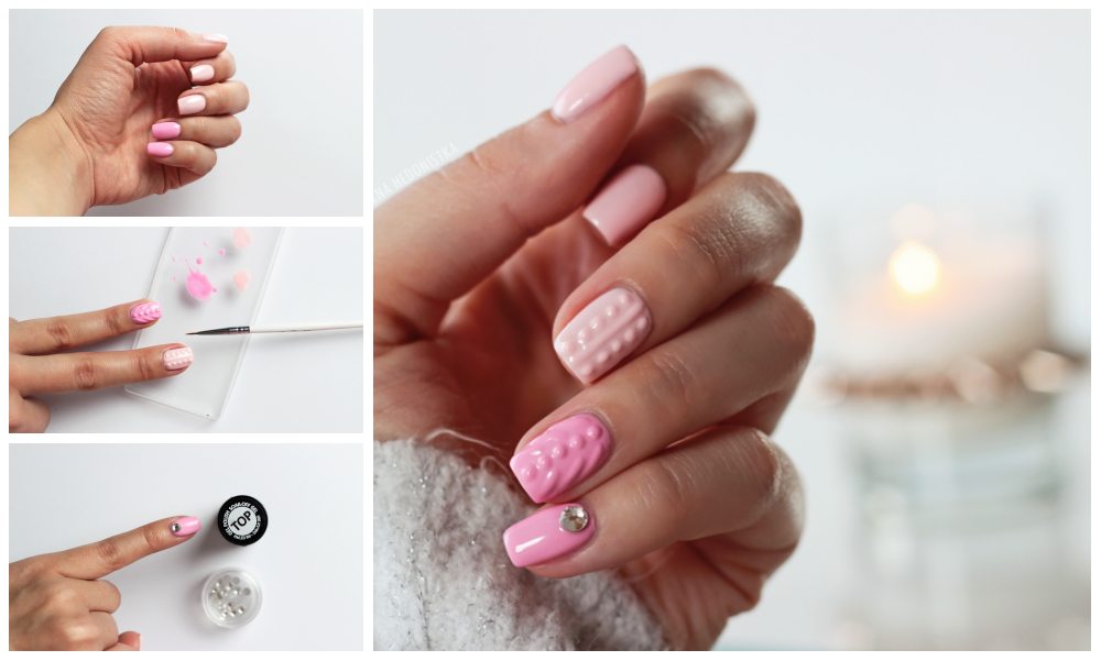 Если у вас есть стразы и хотя бы 2 оттенка гель-лака, среди которых белый, вы сможете повторить следующий интересный дизайн. Техника «вязаный маникюр» пошагово выглядит так: