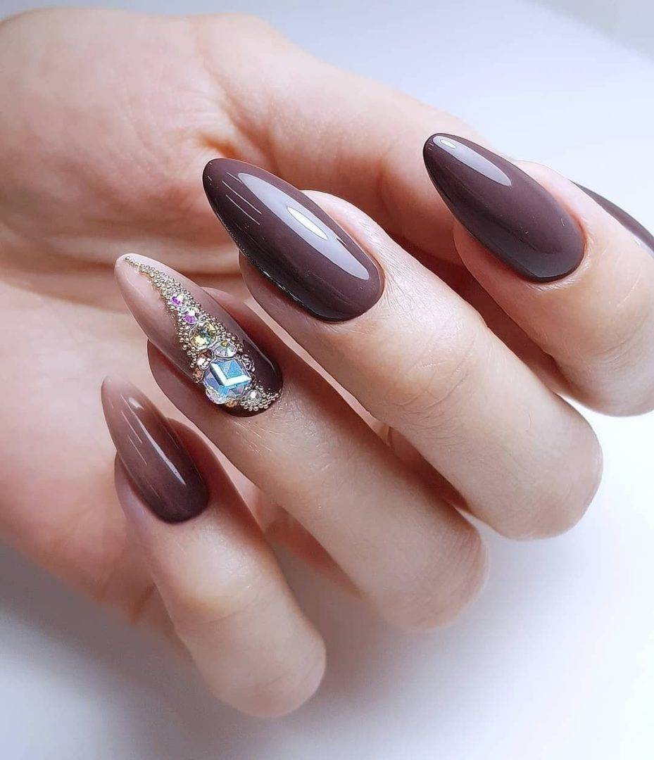 Более выразительно и эффектно смотрятся длинные ногти с модным дизайном в темном гель-лаке. Чтобы темный оттенок не выглядел мрачным, необходимо разбавить его отголосками светлых тонов или элементами в виде страз.