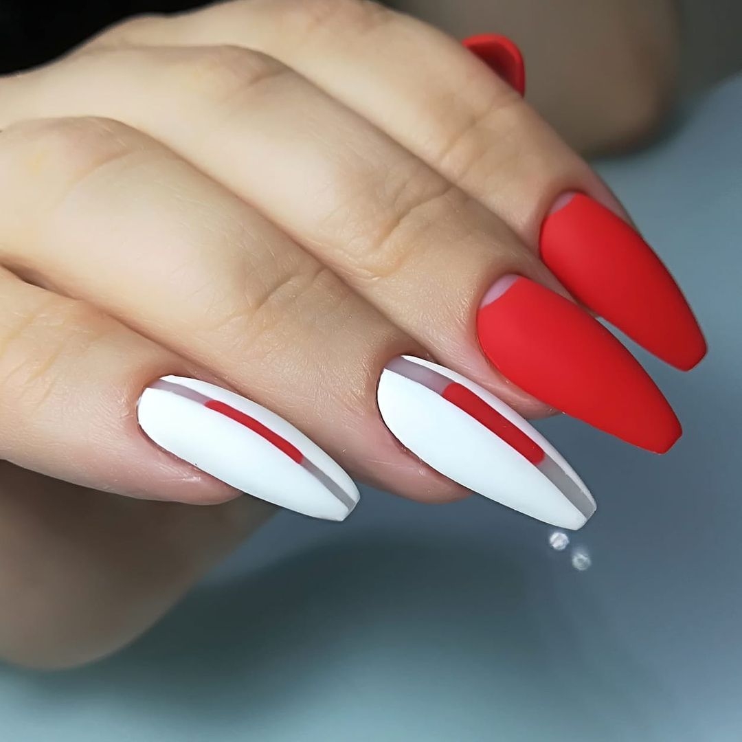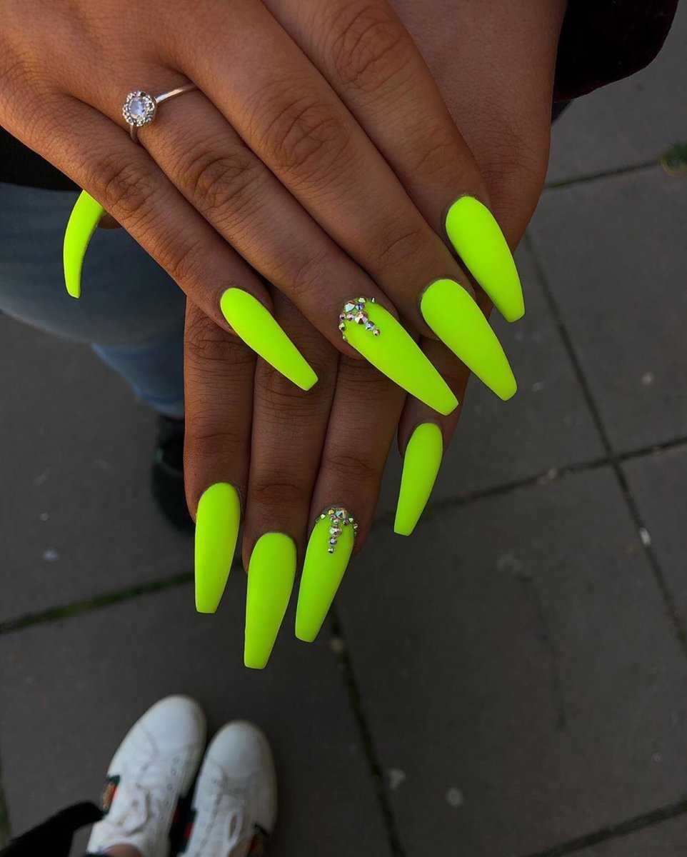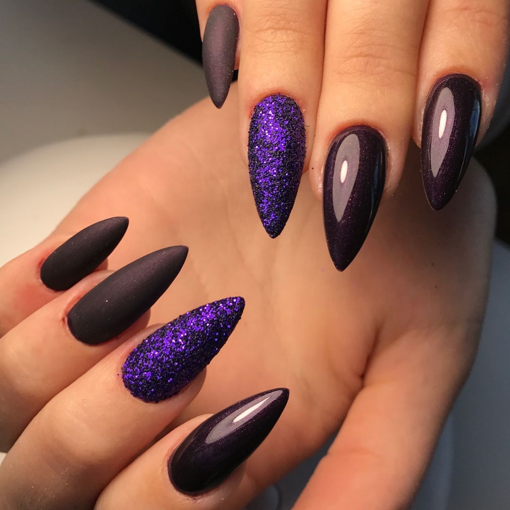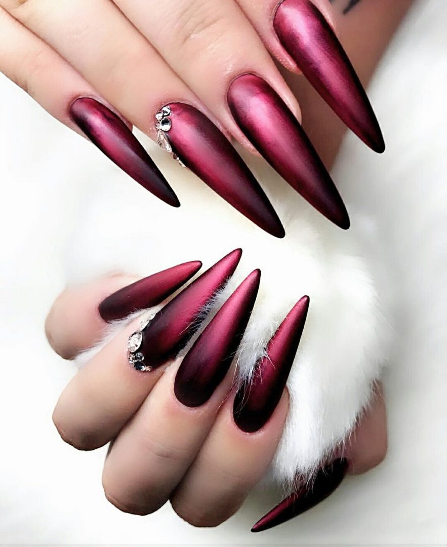 Ногти такой формы сами по себе привлекают внимание, подчеркивают дерзость, поэтому принято считать, что их дизайн тоже должен отличаться броскостью. В качестве покрытия можно использовать лак любого цвета. Отличным решением будет скомбинировать его с матовым топом