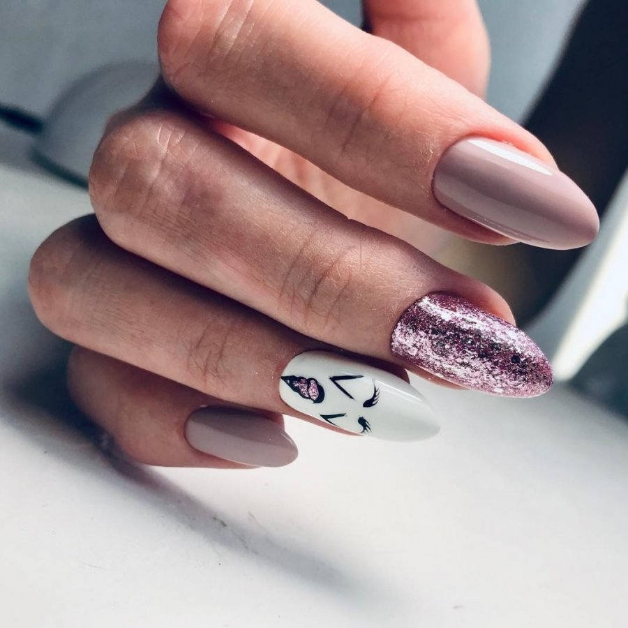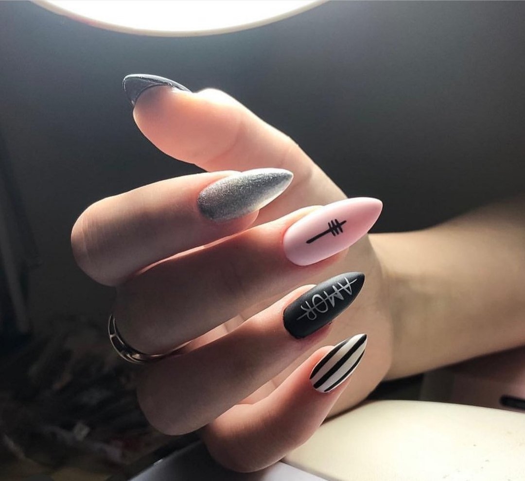 На миндальных ногтях шикарно смотрится дизайн с абстракцией, с надписями, летние узоры с листьями монстеры, с флористикой. Чередуйте рисунки с однотонным покрытием, так маникюр получится сдержанным и красивым.