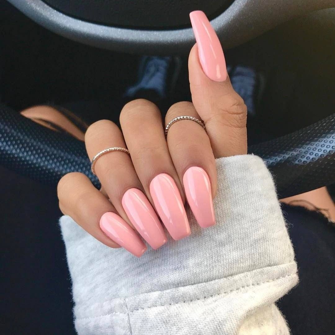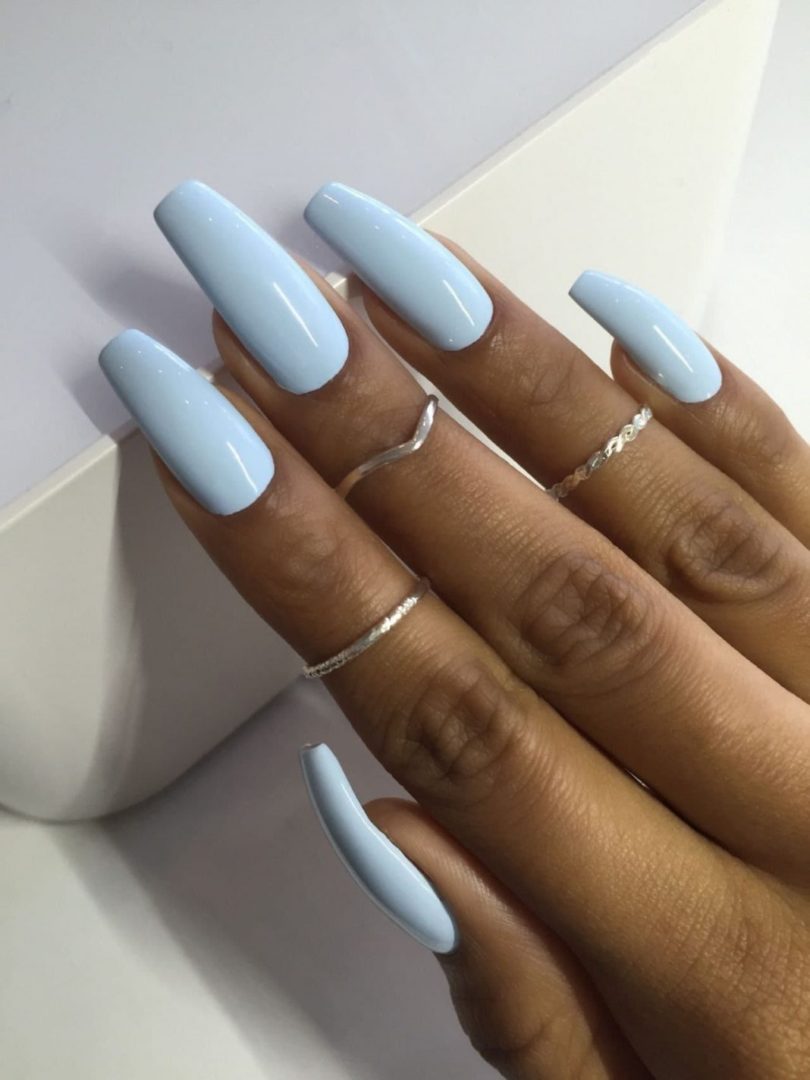 Однотонное глянцевое покрытие – один из простейших способов преображения длинных ногтей. Глянец можно нанести самостоятельно, даже дома. Для придания дополнительного блеска завершающим слоем наносят бесцветный лак. Более интересный образ сделают в салоне.